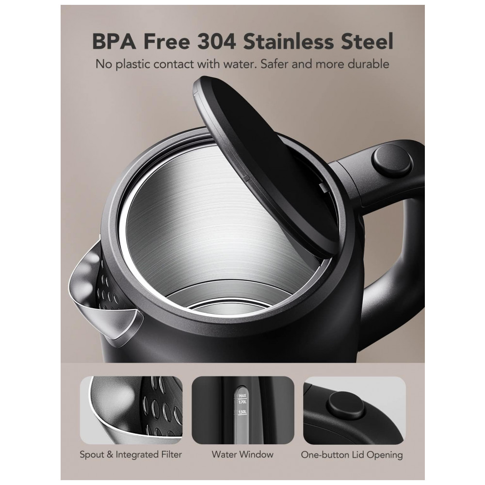 Sabor e segurança Feito com aço inoxidável 304 sem alimentos e sem BPA, que é mais e durável. Com um sensor de temperatura NTC confiável, a chaleira possui desligamento automático, proteção contra fervura a seco e proteção contra temperatura excessiva.