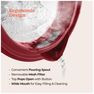 Design ergonômico Esta chaleira elétrica possui um filtro de malha embutido que permite colocar saquinhos de chá ou frutas na água apenas com a água passando. A parte superior abre com o toque de um botão e a boca larga facilita o reabastecimento e a limpeza. Com uma base giratória de 360, você pode acessar facilmente a caldeira HO de todos os ângulos. Fora da base, a chaleira é totalmente sem fio para um vazamento suave. Guarde cuidadosamente o cabo abaixo da base em um slot de zenamento especialmente projetado.