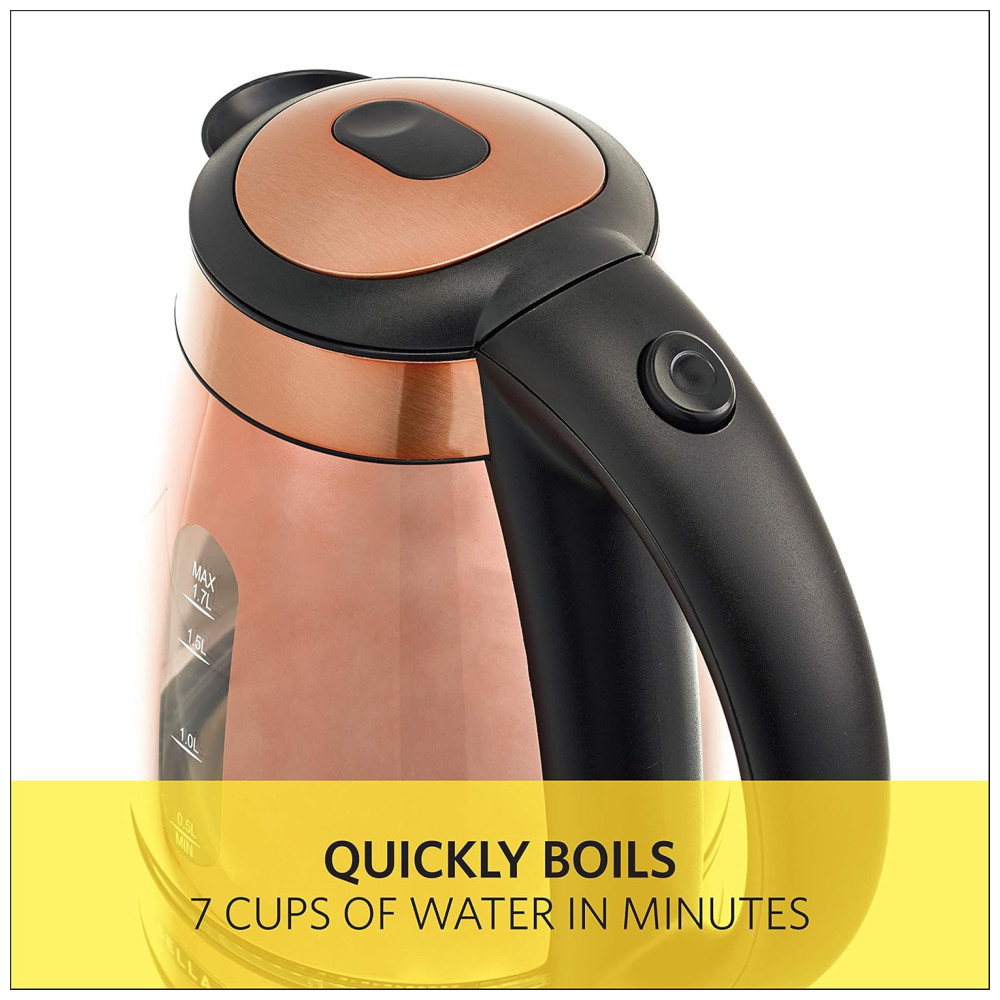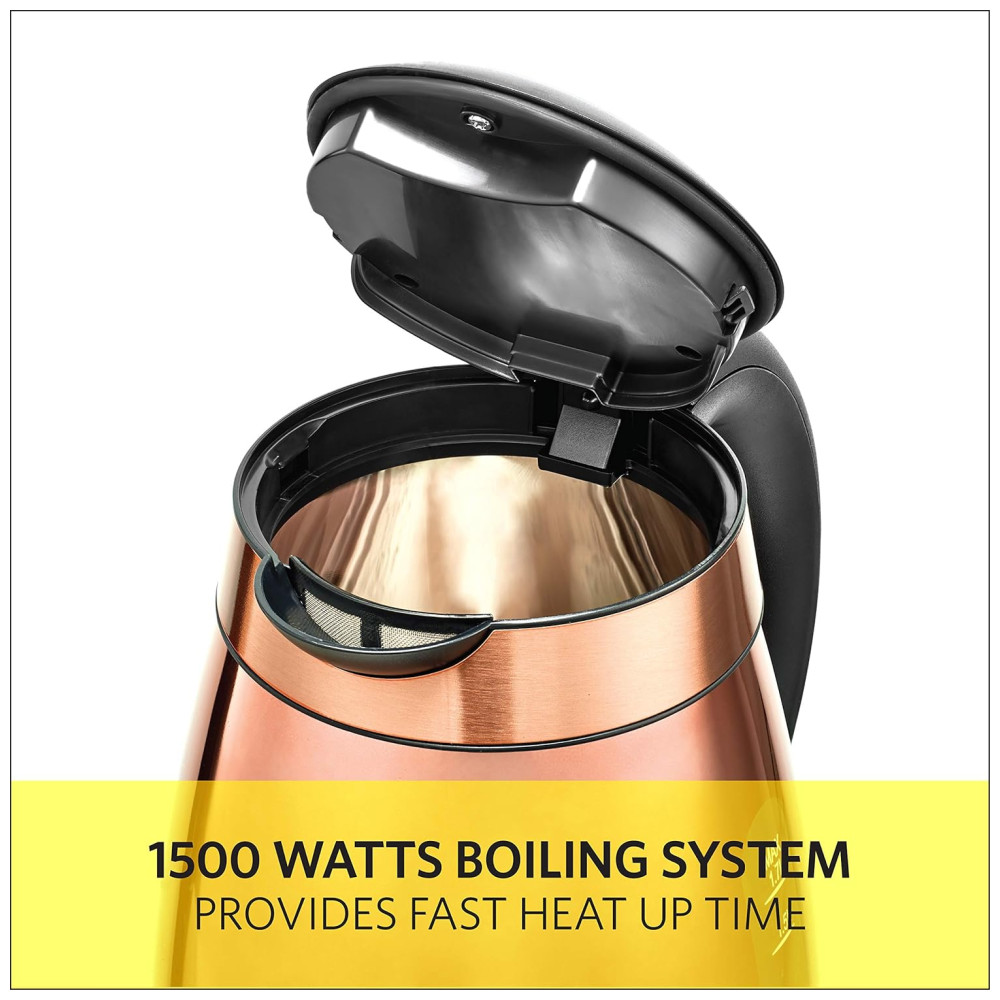 Ferver a água mais rápido que um microondas e mais que um fogão com um toque de um interruptor Esta chaleira elétrica possui um elemento de aquecimento de 1500 watts, base de energia totalmente removível de 360 graus com zenamento de cabos e um design e fácil de usar.
