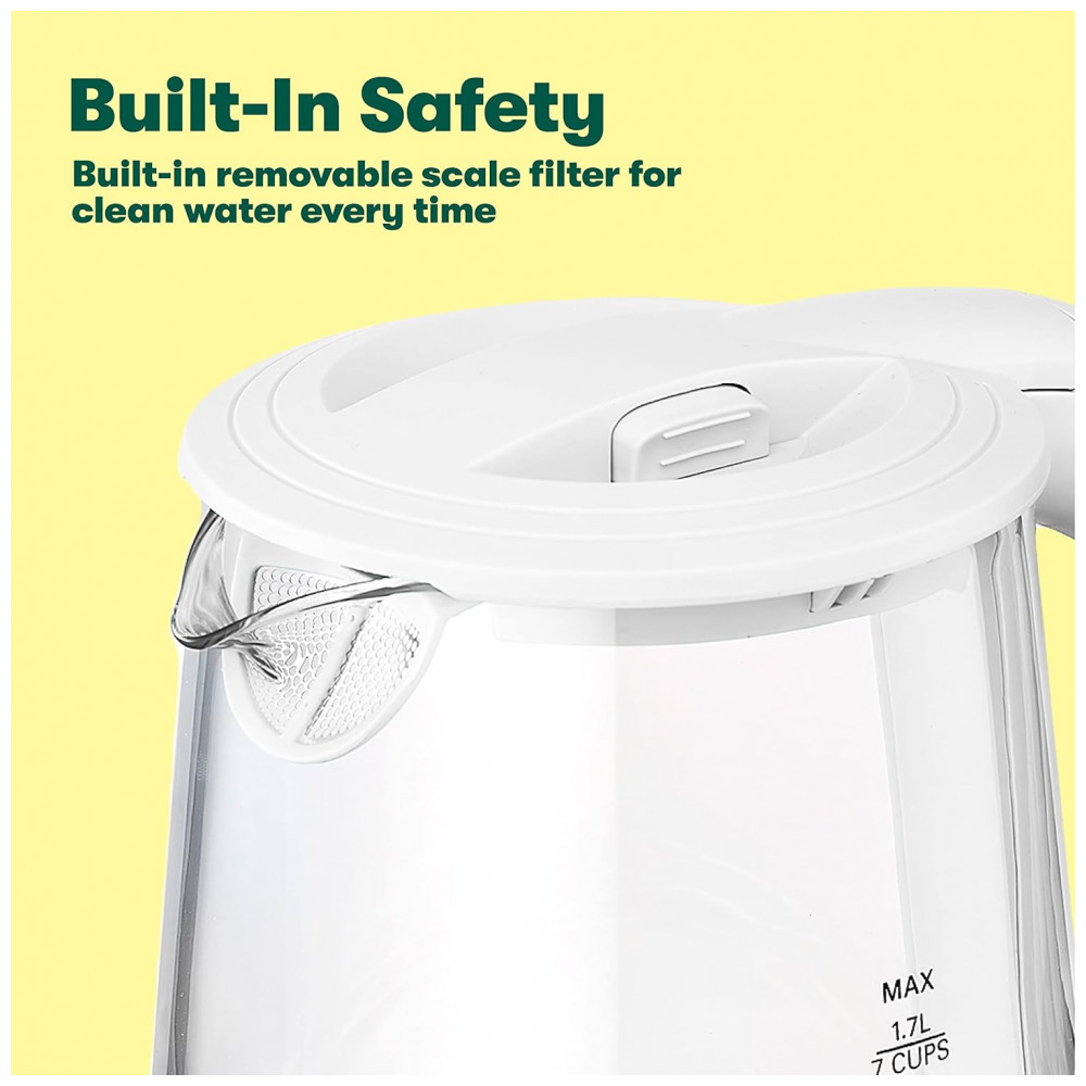 CONSTRUÍDO EM SEGURANÇA O corpo de vidro borosilicato durável combina estilo e funcionalidade. Esta chaleira possui desligamento automático, proteção contra fervura e um elemento de aquecimento oculto para máxima segurança.