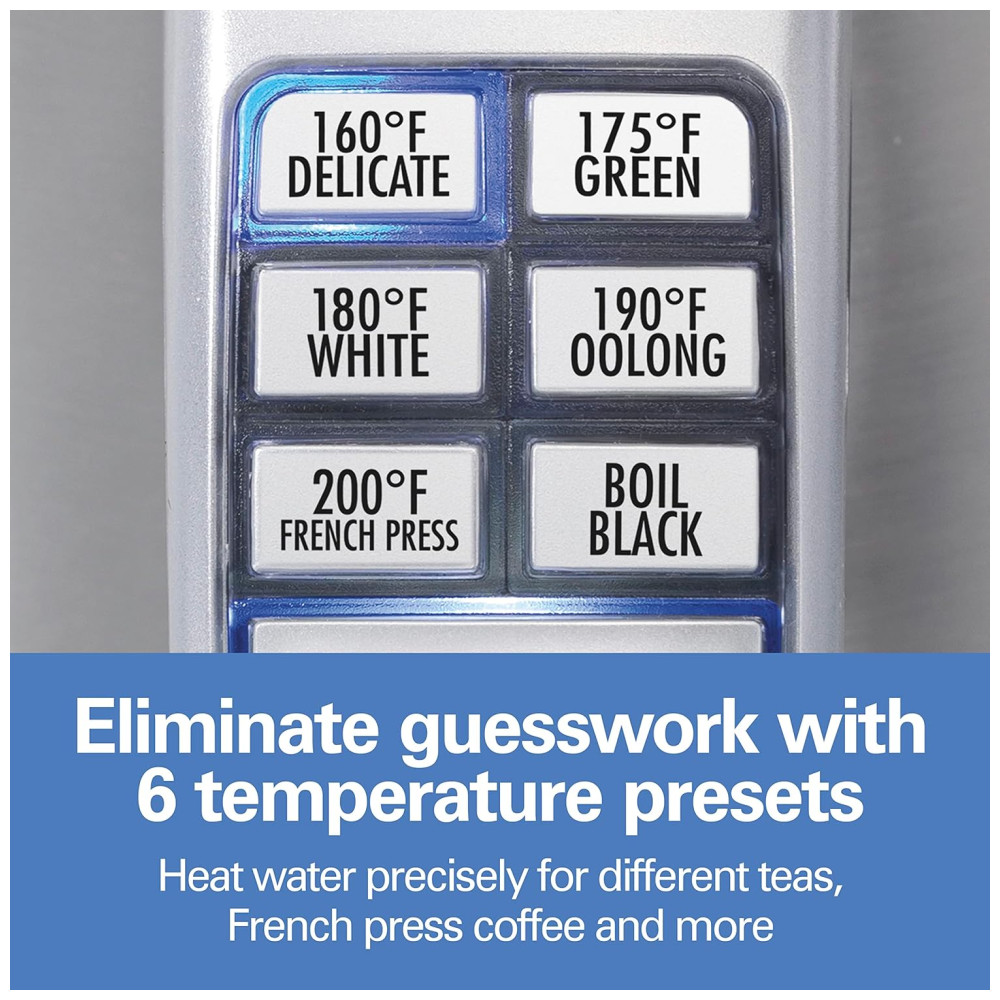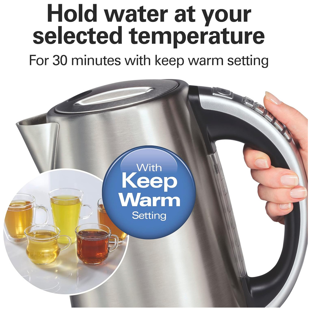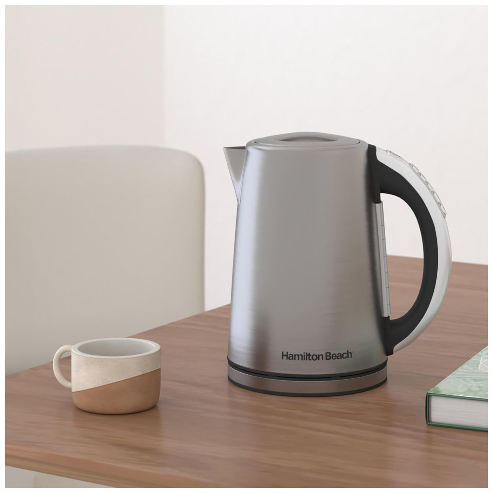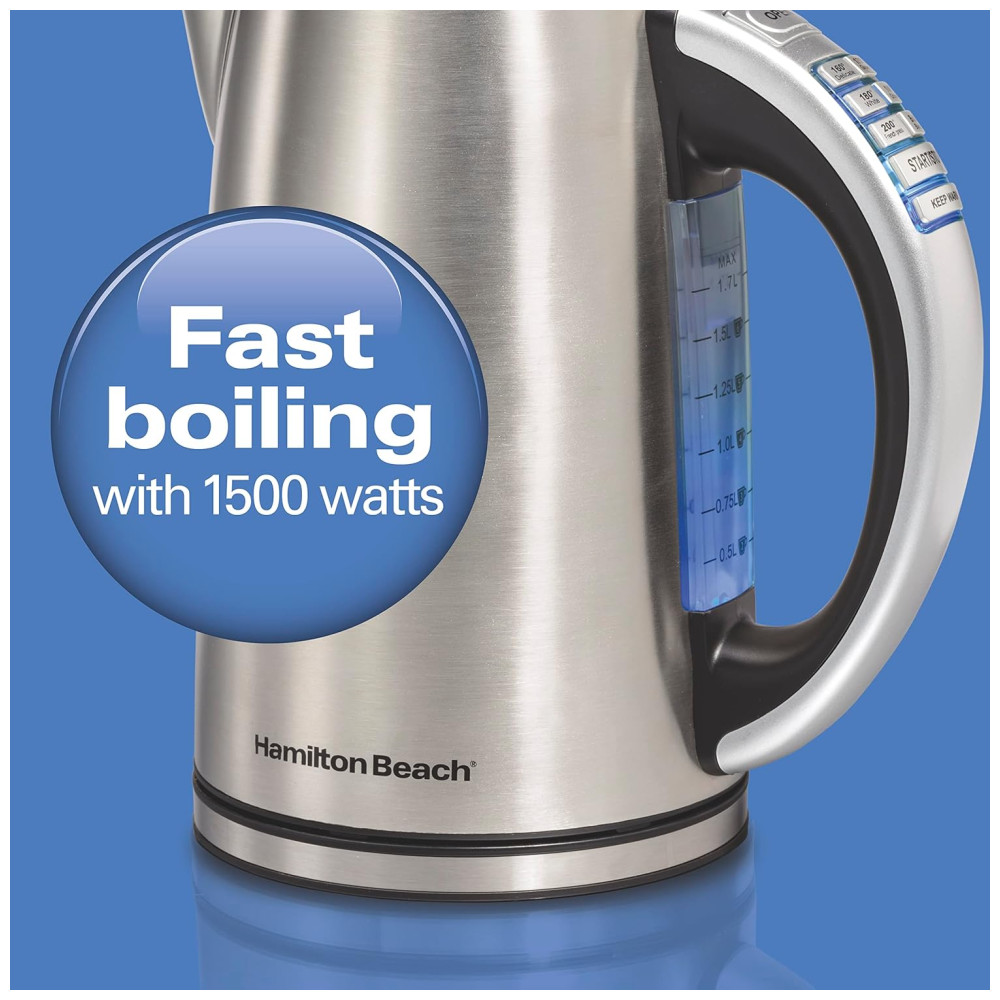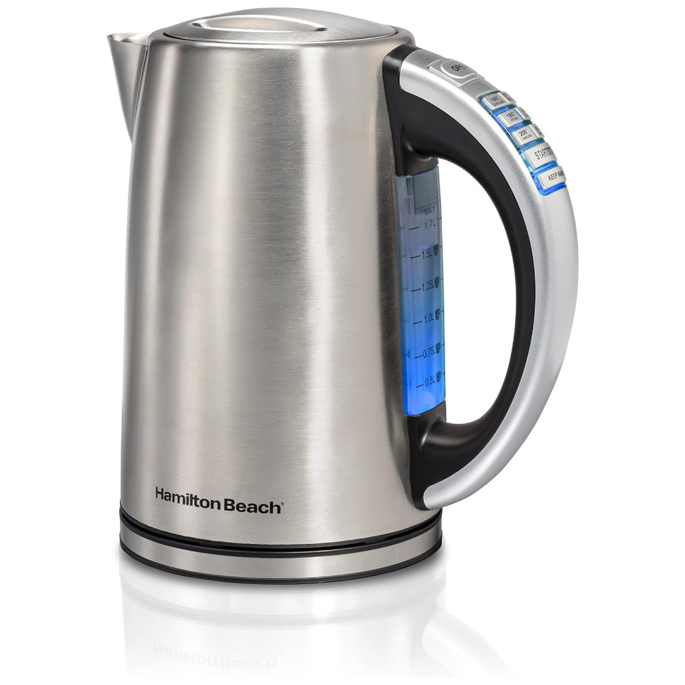 Chocolate quente Sopa instantânea Se você gosta disso, a Hamilton Beach 1. Chaleira elétrica com controle de temperatura em aço inoxidável, caldeira de água e aquecedor de chá com indicador LED, mantenha a proteção quente, com desligamento automático e fervura a seco, em poucos minutos. O poderoso sistema de fervura rápida fornece aquecimento rápido a partir de qualquer tomada padrão e a função de desligamento automático ajuda a impedir que as chaleiras fiquem secas. As chaleiras da Hamilton Beach são ótimas e fáceis de usar. Além disso, a maioria das chaleiras inclui uma base rotativa ou sem fio de 360 graus para facilitar o serviço. As chaleiras de Hamilton Beach apresentam uma alça para manter a calma e um bico sem gotejamento que facilita o vazamento