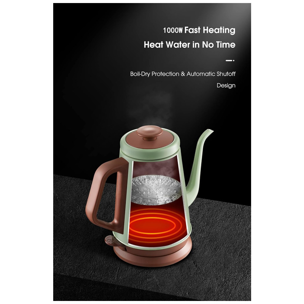 Proteção contra fervura a seco e desligamento automático A chaleira elétrica tipo pescoço de ganso possui design de desligamento automático. Certifique se de cobrir com a tampa quando precisar ferver a água e ela desligará automaticamente quando a água atingir a temperatura desejada. Além disso, a chaleira elétrica pára de funcionar ao ferver sem água e volta a funcionar quando está totalmente fria. A proteção contra fervura a seco pode efetivamente proteger a chaleira contra danos ao pressionar acidentalmente o botão de trabalho.