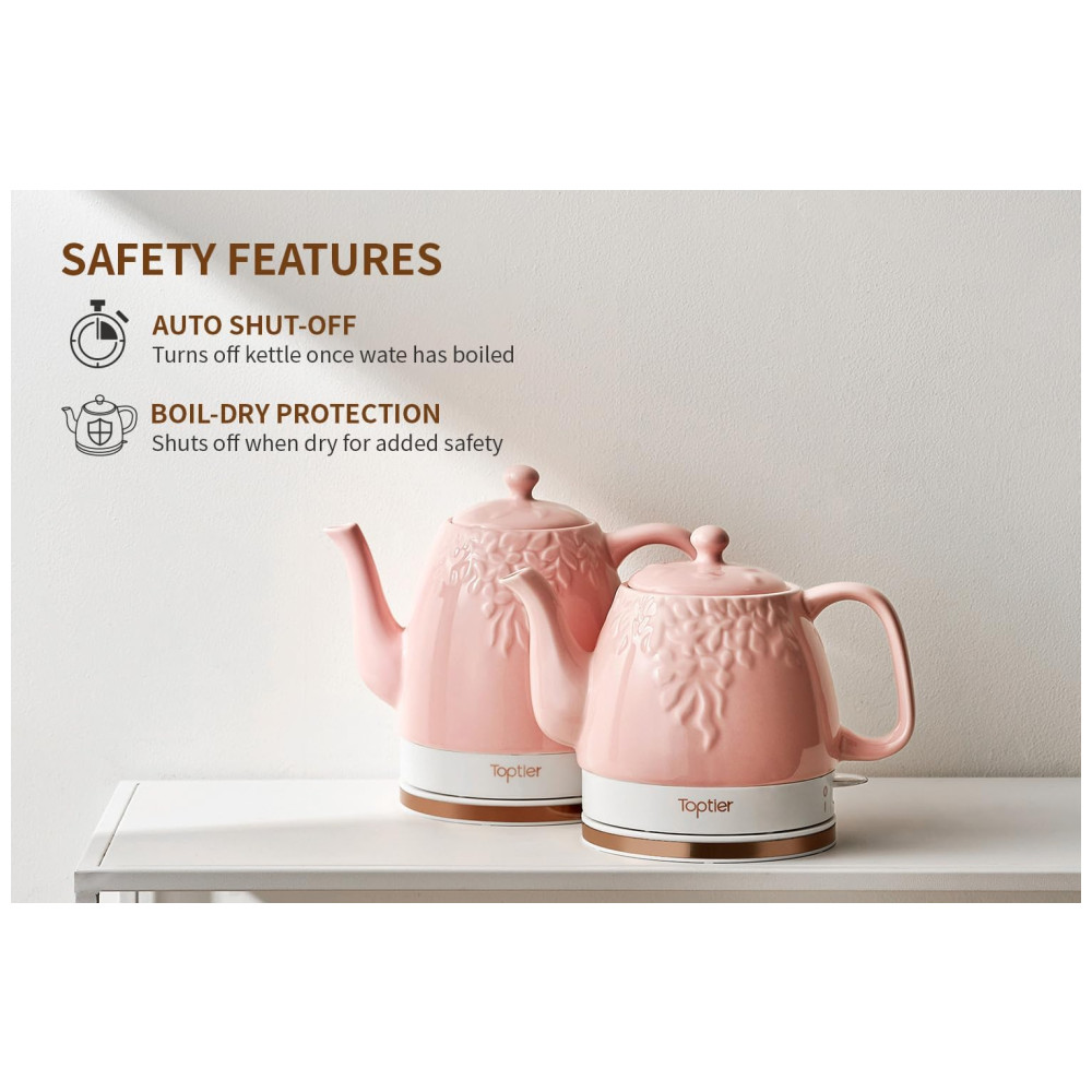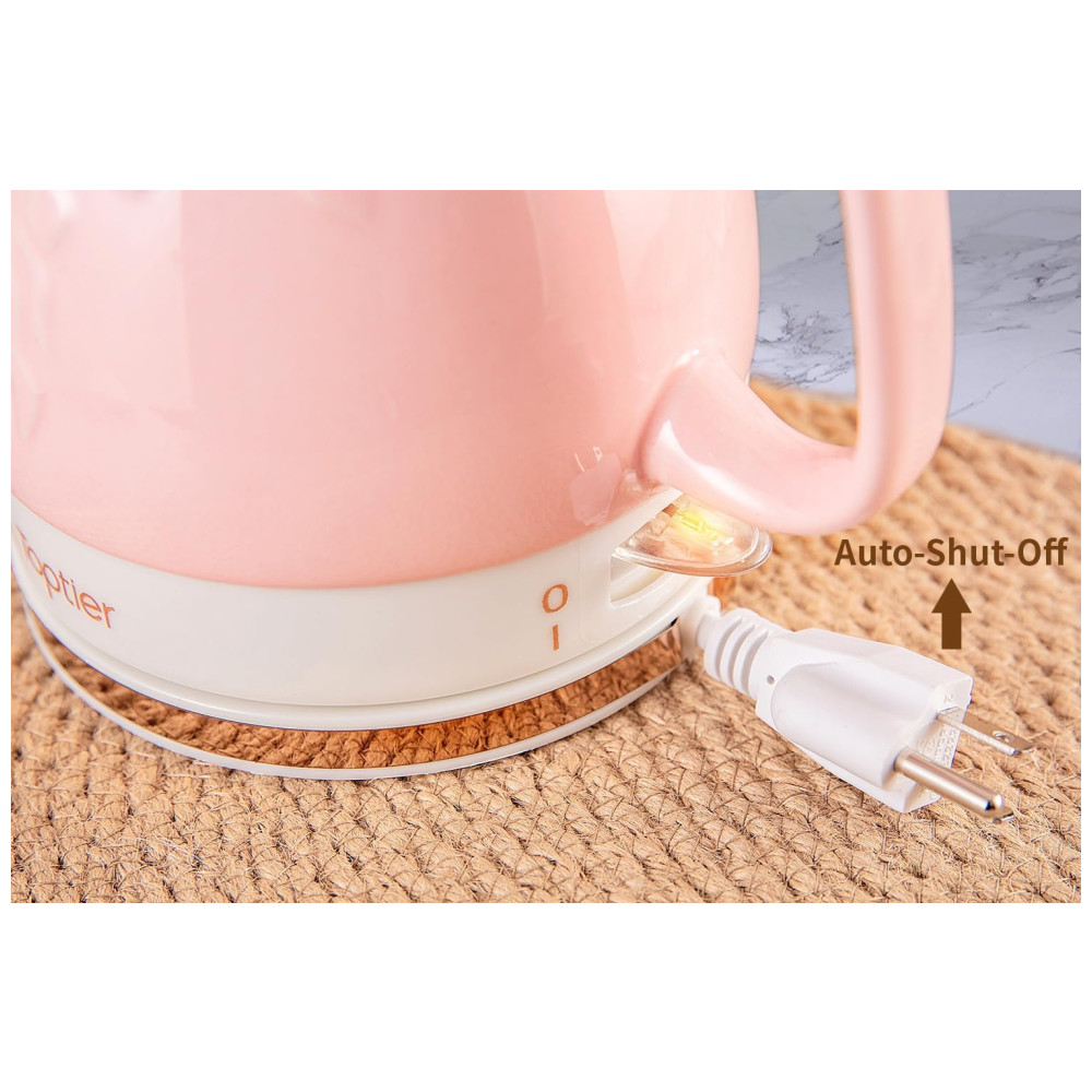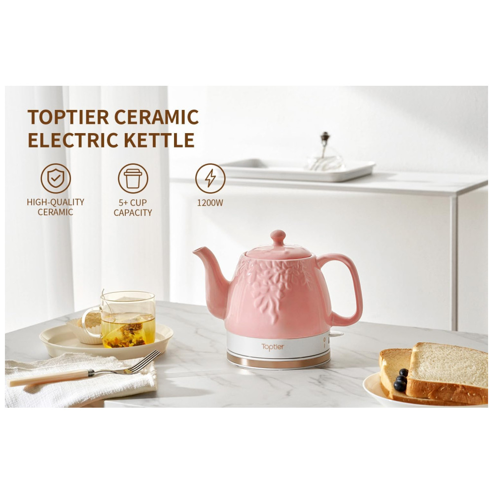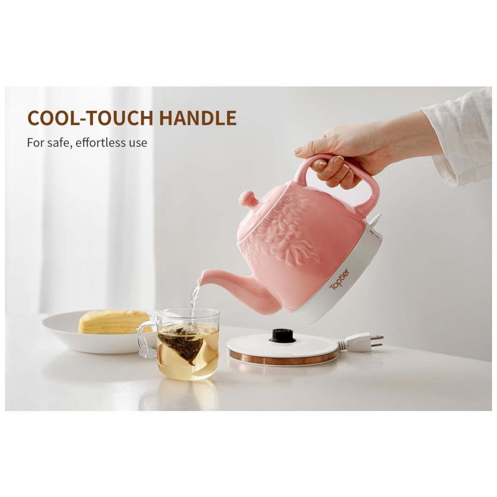 ESSENCIAL PARA SUA COZINHA Completamente sem fio quando fora da base de ouro rosa, a chaleira Toptier Ceramic Electric Kettle permite derramar fácil e desobstruído. O corpo de porcelana rotacional 360 é perfeito para ferver água