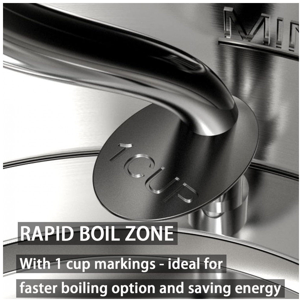 ZONA DE EBULIÇÃO RÁPIDA Marcações horizontais brilhantes dentro da chaleira ajudam a medir 1 xícara de ebulição ultrarrápida. Ferva um copo de água fria 235ml em 90 segundos.