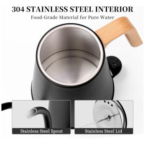 Aço inoxidável para qualidade alimentar: A chaleira para café com goseneck é feita de aço inoxidável 304 de qualidade alimentar, incluindo o interior da chaleira elétrica em aço inoxidável, tampa e bico, o que garante que é para você. A tampa removível facilita a limpeza da chaleira elétrica da caldeira de água. O design da porção sem fio torna a chaleira elétrica ótima para qualquer ocasião