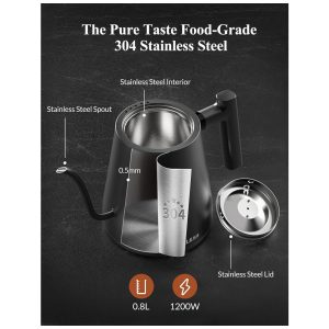 O sabor puro o interior, a tampa e o bico duráveis desta chaleira elétrica são feitos de aço inoxidável 304 de qualidade alimentar, sem BPA e sem ferrugem.