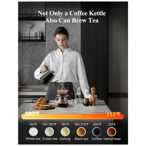Operação silenciosa e zenamento fácil a base aquecida da chaleira de café pescoço de cisne tem um botão de ajuste de temperatura e três botões iniciar, cancelar, manter quente e converter Fahrenheit, Celsius.