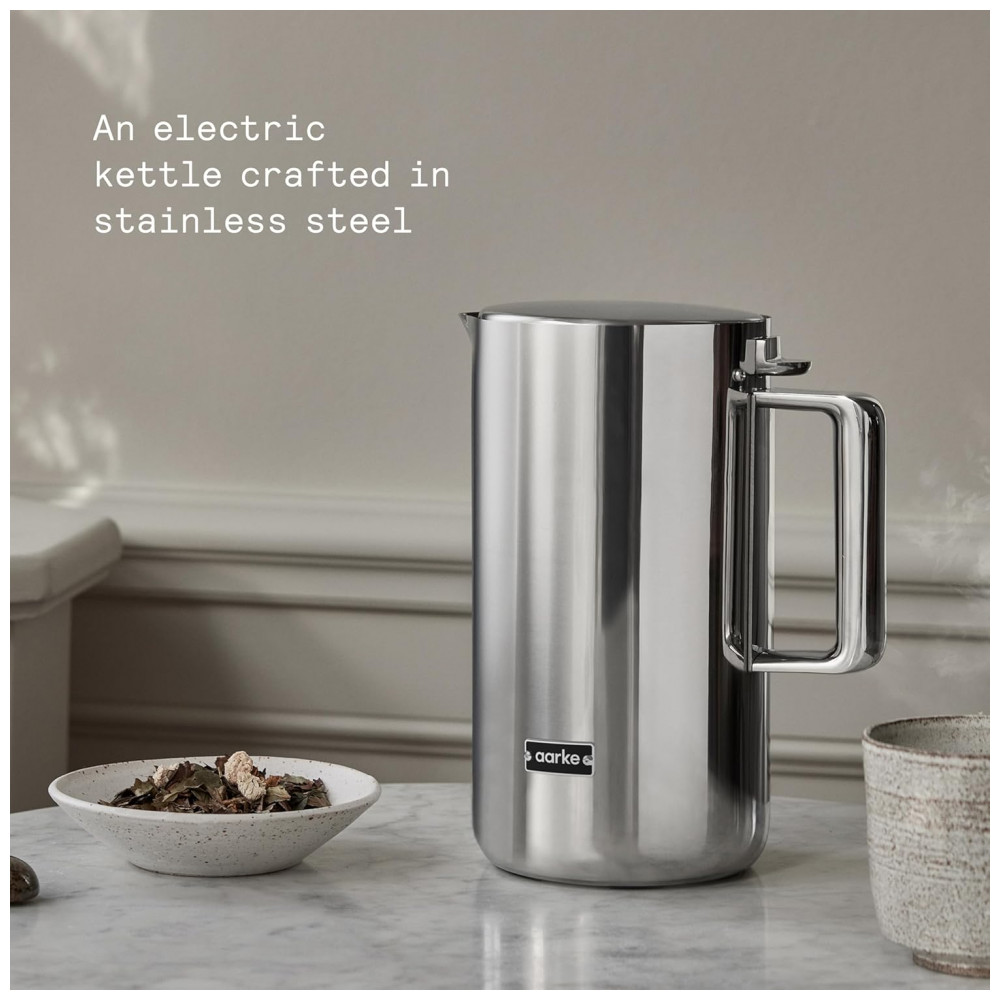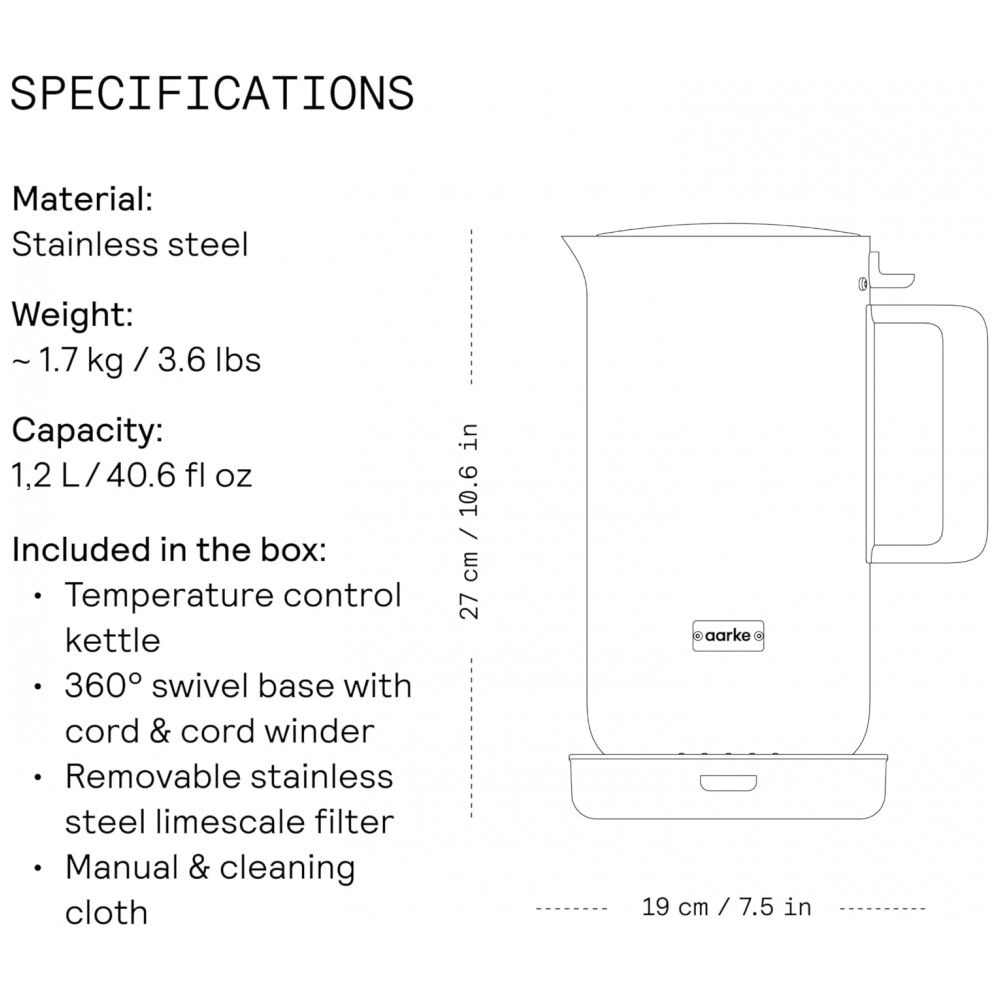 Chaleira elétrica em aço inoxidável com controle de temperatura, desenvolvida para aquecimento de água em diferentes faixas térmicas para café, chá e outras bebidas quentes. A capacidade de 1,2 L, aliada à base com giro de 360° e cabo com organizador, permite uso prático em bancadas domésticas.