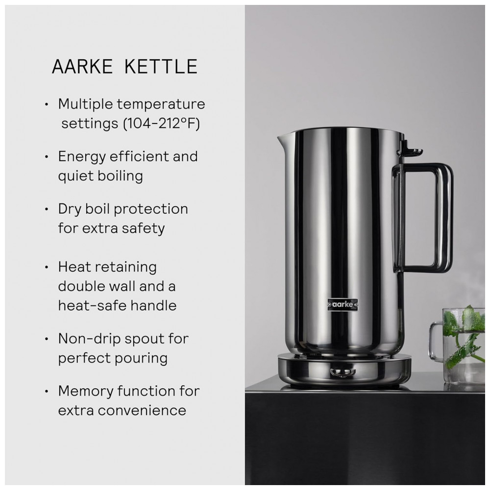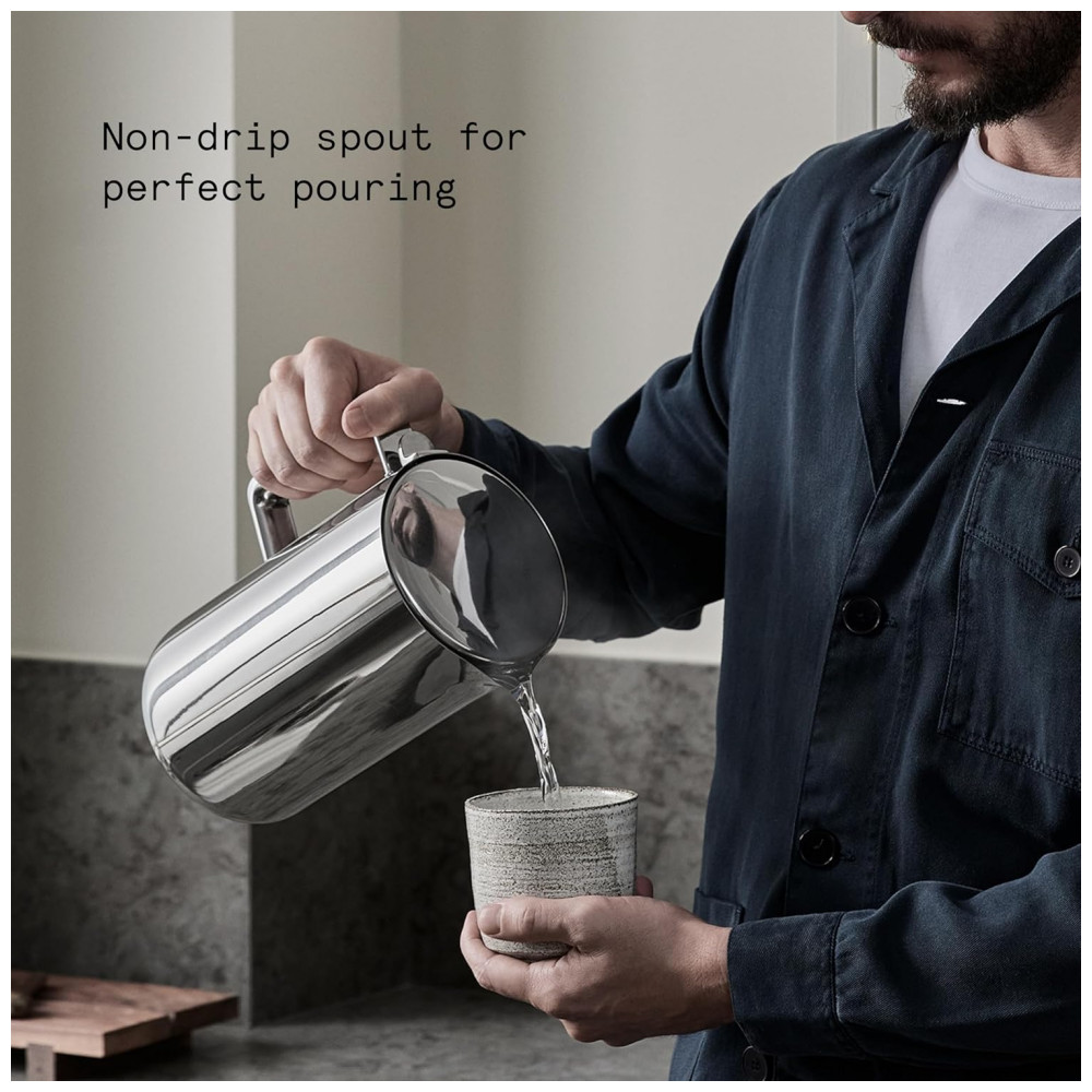 A estrutura de parede dupla contribui para retenção de calor e operação mais silenciosa, enquanto o bico antirrespingo favorece o vertimento preciso. O sistema de proteção contra fervura a seco e o desligamento automático aumentam a segurança, e o indicador de resfriamento em LED auxilia no monitoramento da temperatura após o aquecimento.