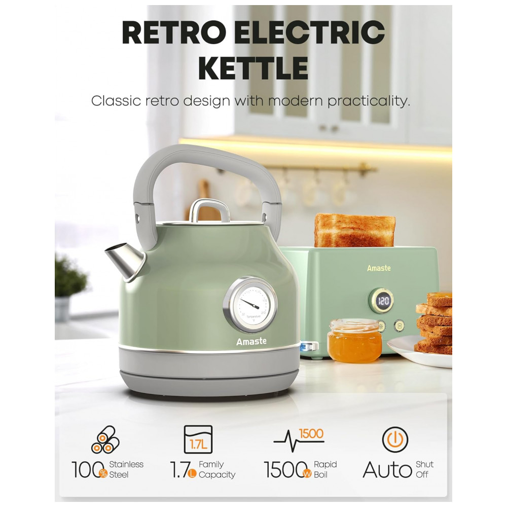 Chaleira Elétrica Amaste 17L Inox Verde Matcha Termômetro Retro 1500W Proteção Antisseco Tampa Removível BT-K15FT 110V