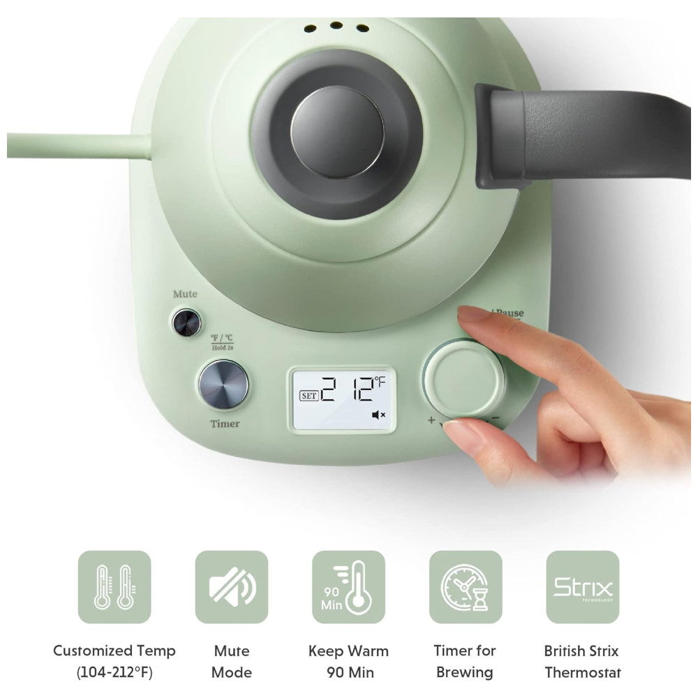 Conforto Alça ergonômica de toque frio e face externa de toque fosco para conforto e bico de vazamento perfeito para derramamento preciso de água quente sem pingos. Ao contrário da maioria das outras chaleiras elétricas, esta chaleira possui um modo silencioso e, se você não quiser esse alerta sonoro, basta pressionar Mudo para ativar, desativar os bipes.