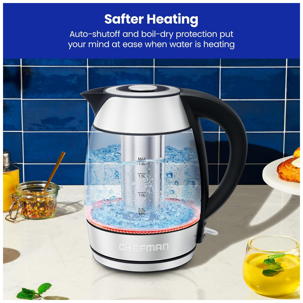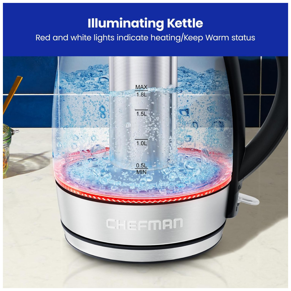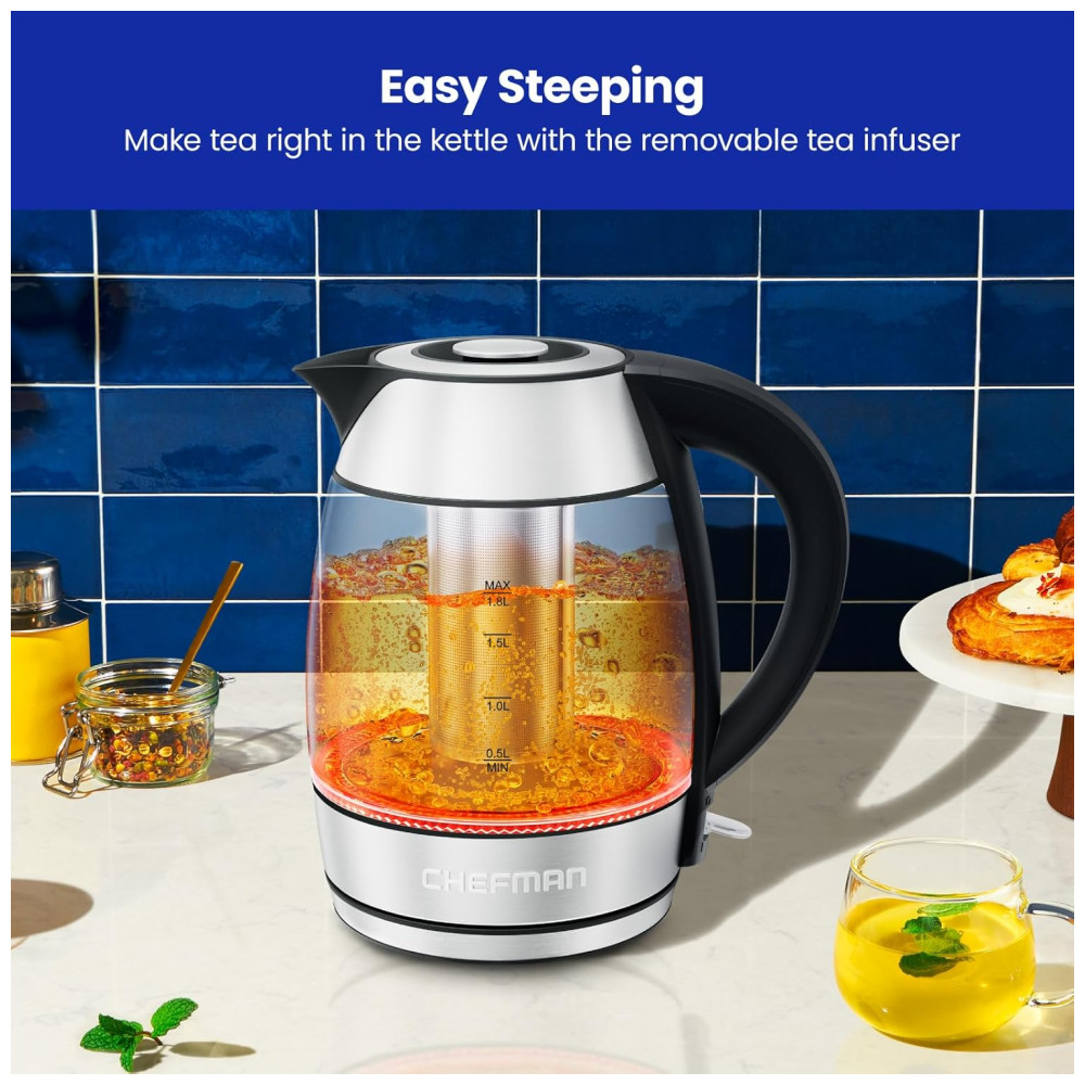 Chaleira Elétrica Chefman de Vidro 18L 1500W c/ Infusor de Chá Manter Quente Desligamento Automático e Proteção contra Fervura
