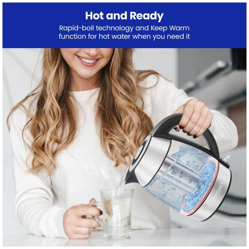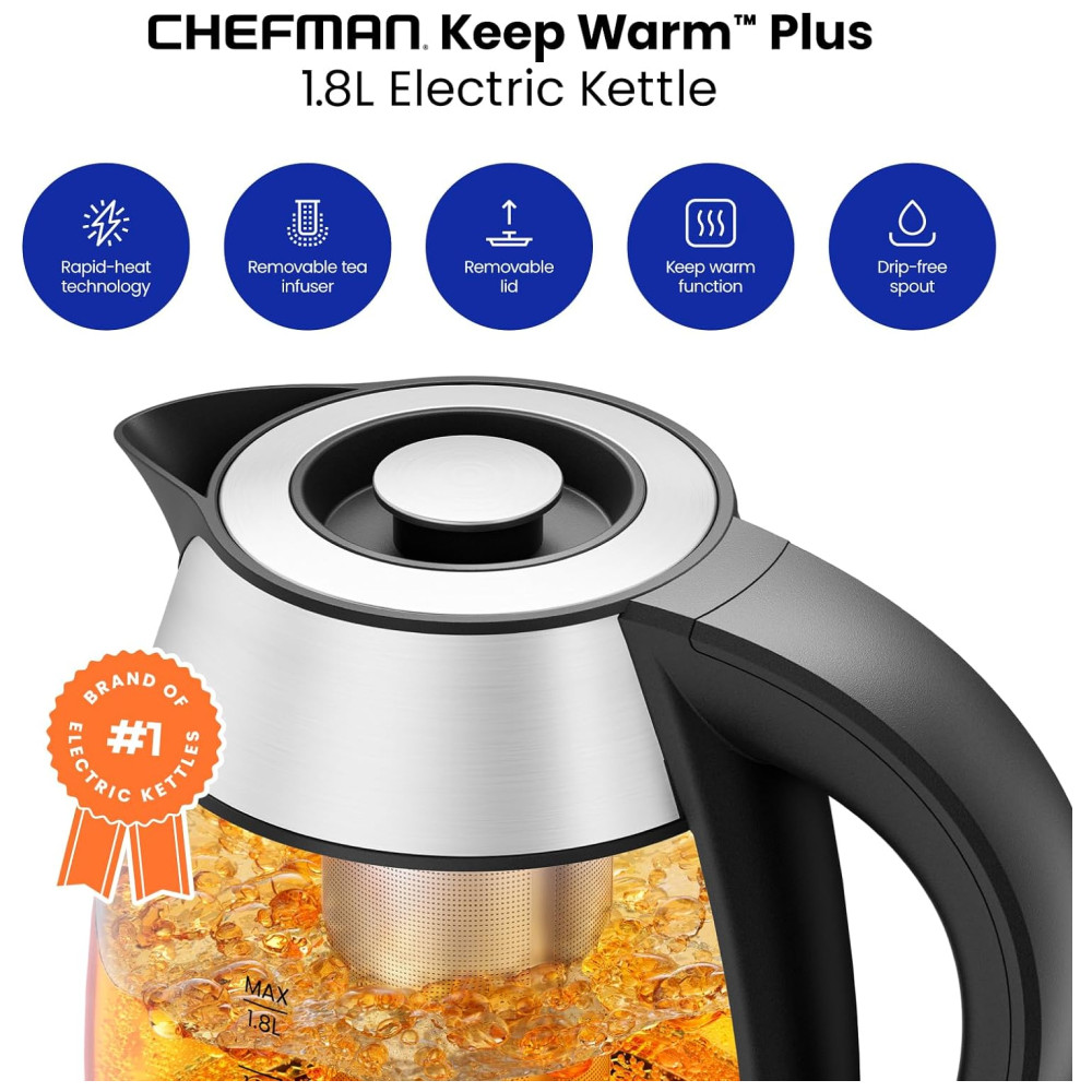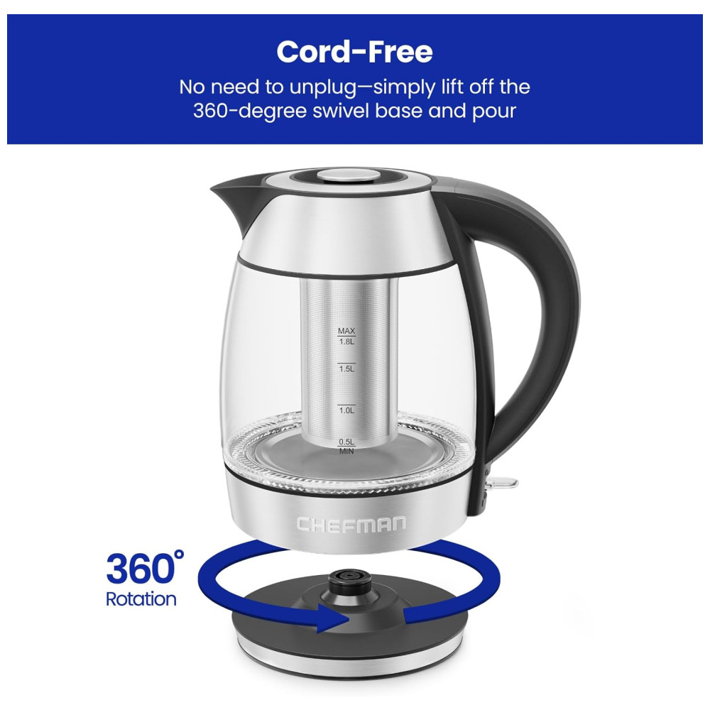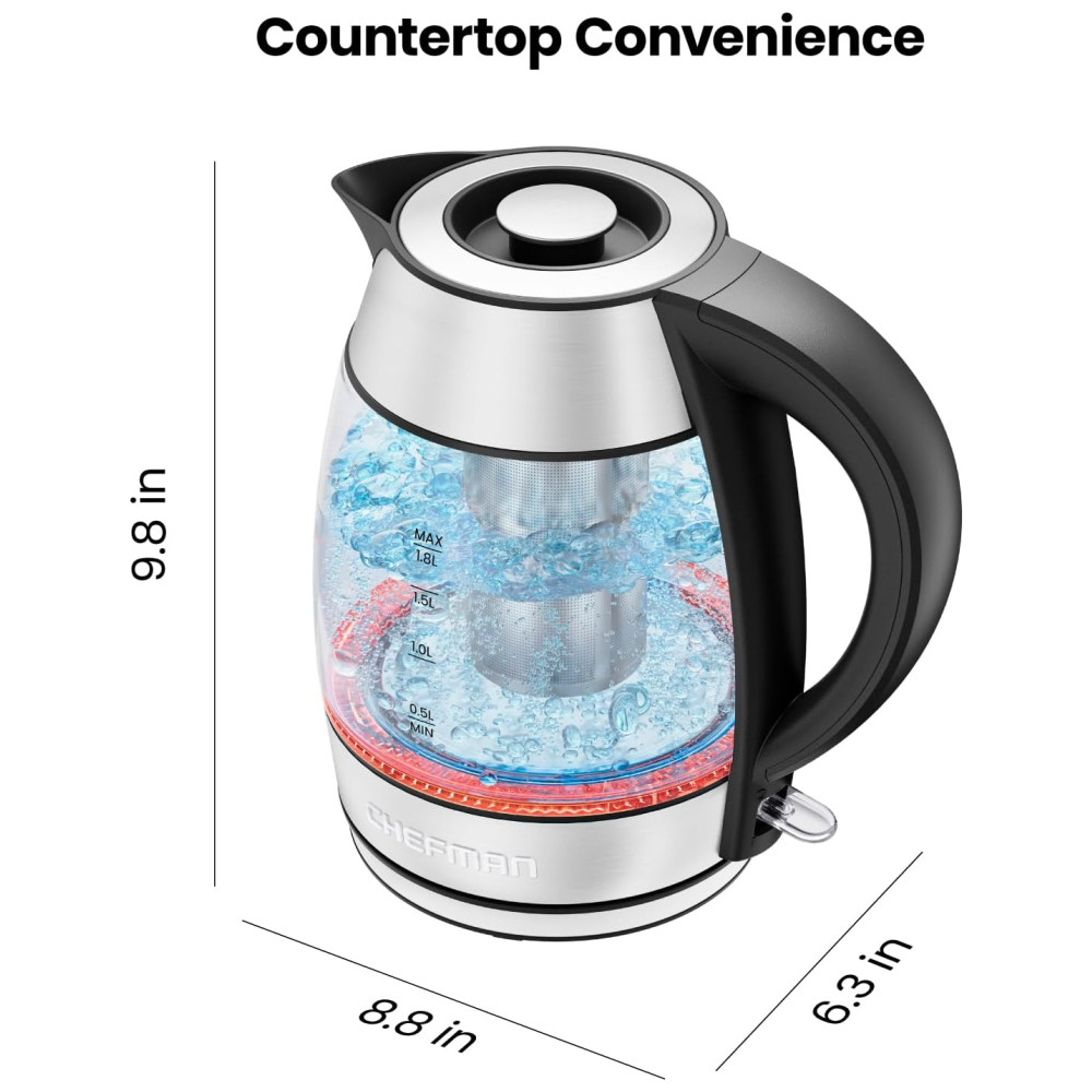 Chaleira Elétrica Chefman de Vidro 18L 1500W c/ Infusor de Chá Manter Quente Desligamento Automático e Proteção contra Fervura