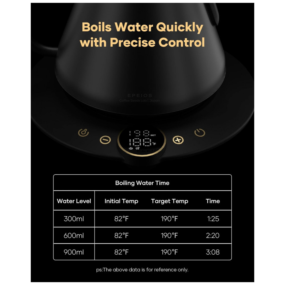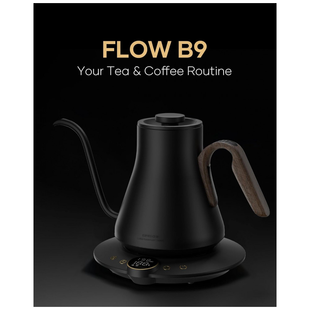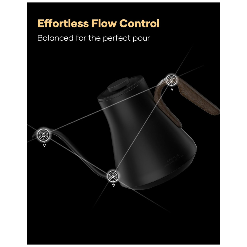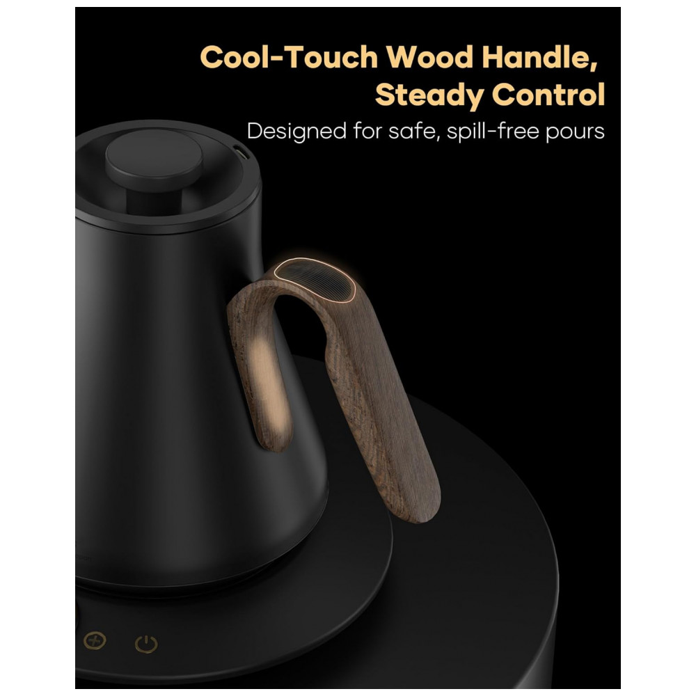 O bico em formato pescoço de ganso em S foi projetado para fluxo contínuo e controlado, favorecendo extrações filtradas com maior precisão. A base incorpora display digital de 1,42″ para ajuste de temperatura e acompanhamento em tempo real, além de função manter aquecido por até 1 hora. O corpo em acabamento Goya Walnut combina aço inoxidável com visual inspirado em madeira, voltado a estações de café domésticas e ambientes de consumo de bebidas especiais.