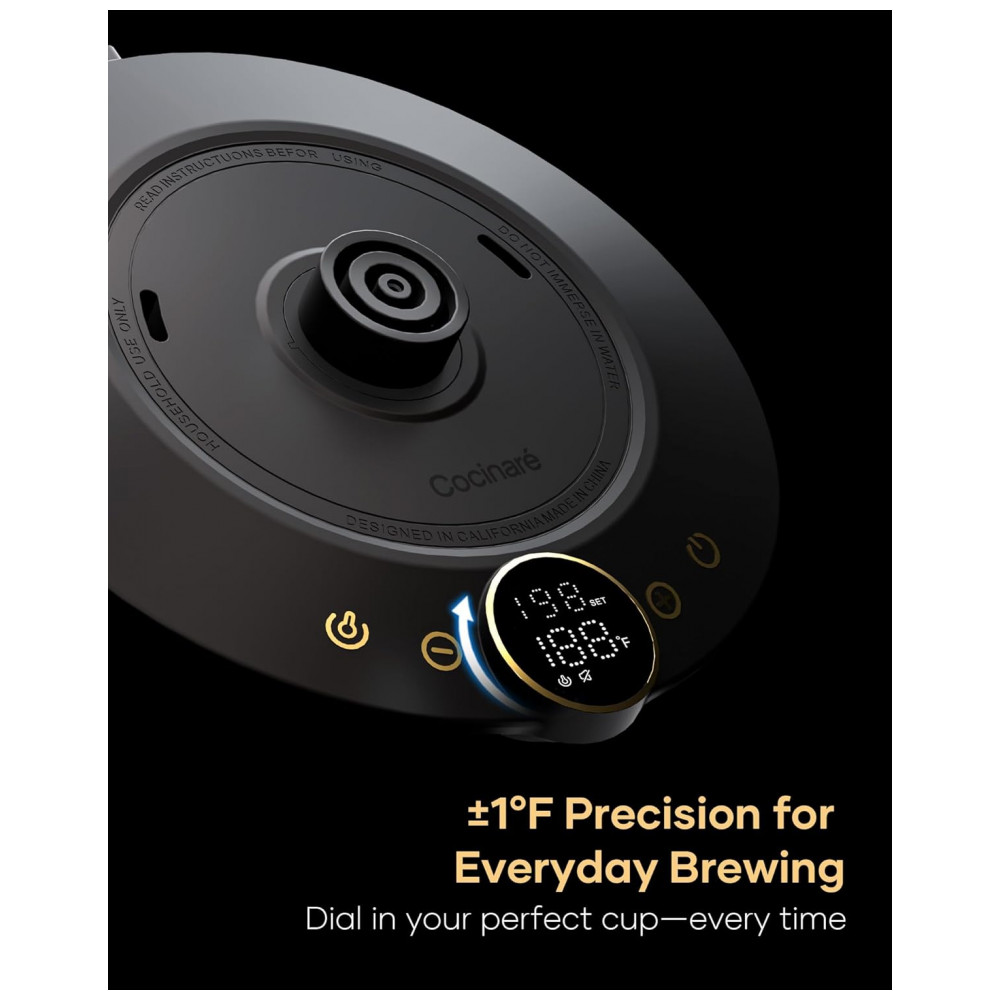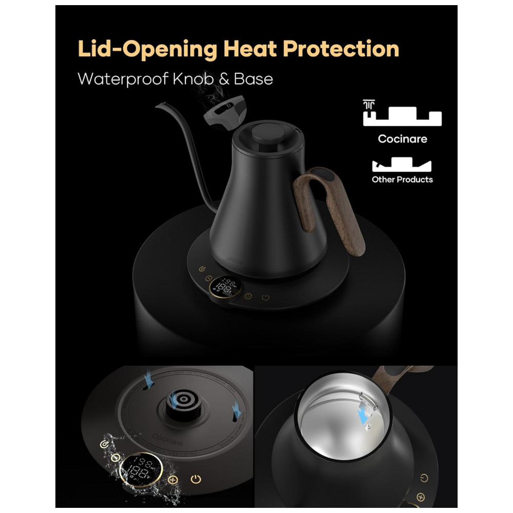 A chaleira elétrica Cocinare FLOW B9 Goya Walnut foi desenvolvida para preparo de café pour-over, chás e outras bebidas quentes com controle preciso de temperatura em capacidade de 0,9 litro. O interior em aço inoxidável 304 em contato com a água é livre de BPA, indicado para uso diário em rotinas de preparo de bebidas quentes. O sistema de aquecimento utiliza resistência elétrica de até 1500W para aquecimento rápido, mantendo a água próxima ao valor de temperatura selecionado por meio de base inteligente com controle eletrônico.