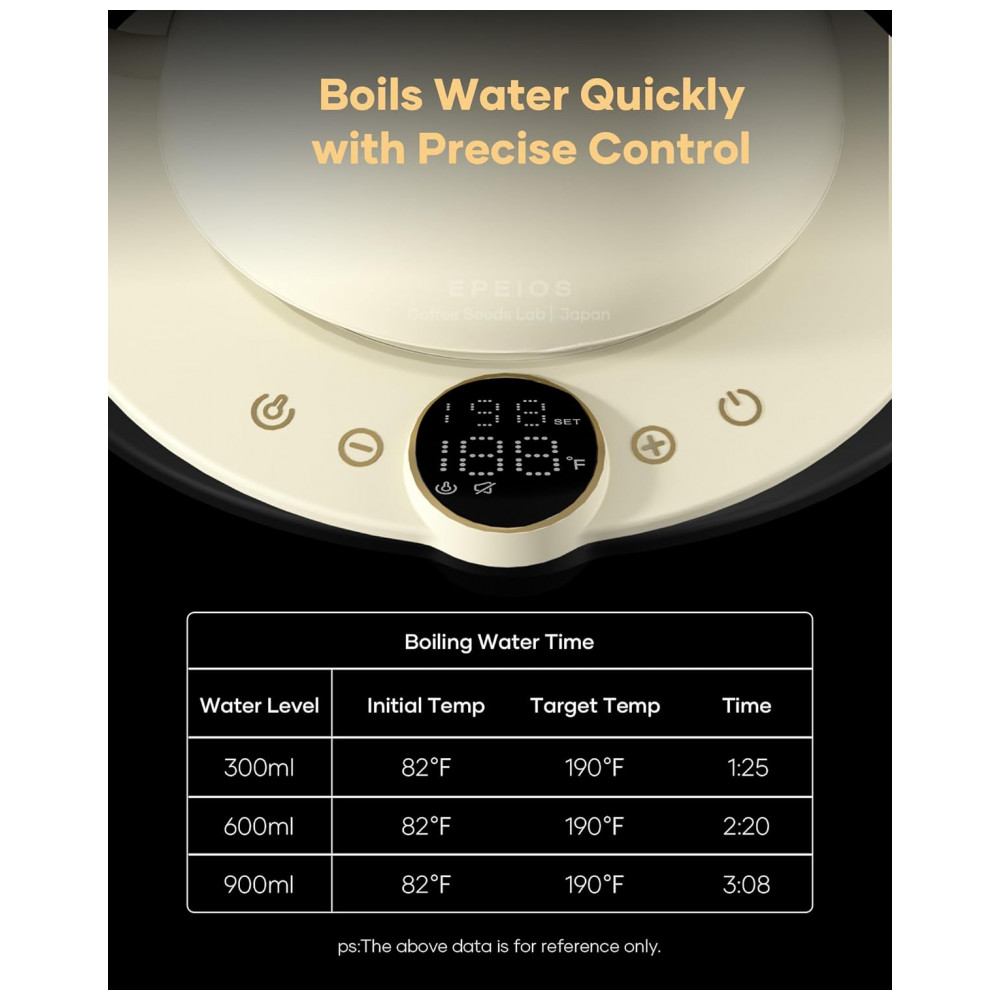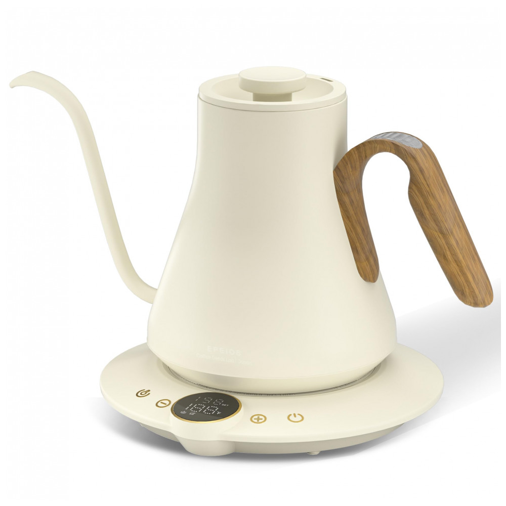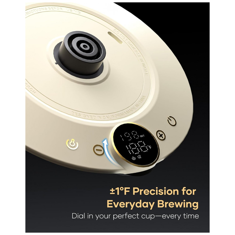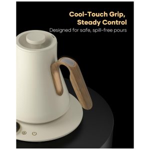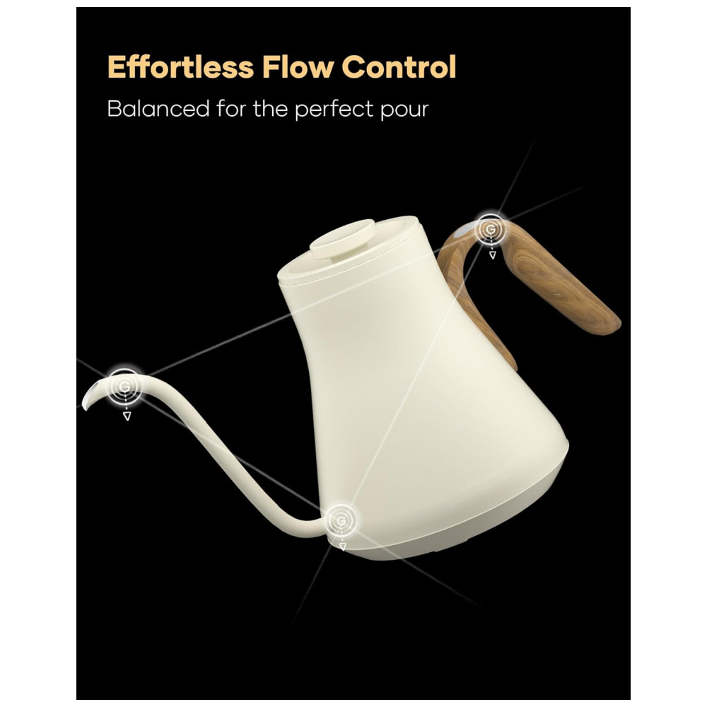 O bico em formato pescoço de ganso em S foi desenvolvido para fluxo contínuo e controlado, favorecendo extrações filtradas com maior precisão. A base integra display digital de 1,42″ para ajuste de temperatura, exibição em tempo real e acesso ao timer de preparo, que auxilia no controle do tempo de extração. O acabamento Morandi White combina corpo metálico em tom branco suave com design voltado a estações de café domésticas e ambientes de consumo de bebidas especiais.