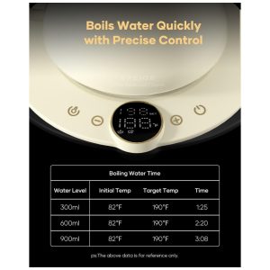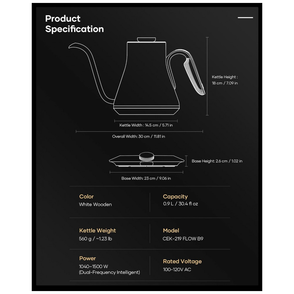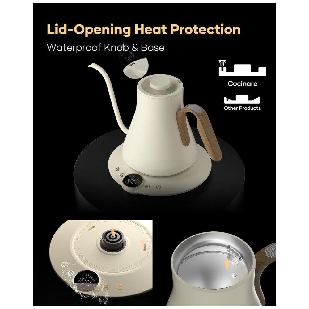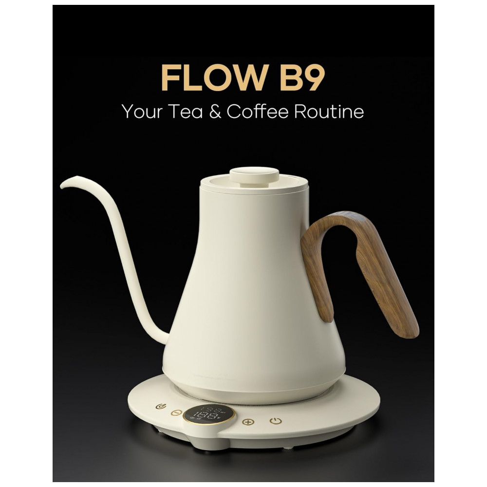 A chaleira elétrica Cocinare FLOW B9 Morandi White foi projetada para preparo de café pour-over, chás e outras bebidas quentes com controle preciso de temperatura em capacidade de 0,9 litro. O interior em aço inoxidável 304 em contato com a água é livre de BPA, indicado para uso diário em preparo de bebidas quentes com foco em estabilidade térmica e durabilidade. A base aquecedora utiliza resistência de 1500W para aquecimento rápido, mantendo a água próxima ao valor de temperatura selecionado por meio de controle eletrônico e função manter aquecido por até 1 hora.