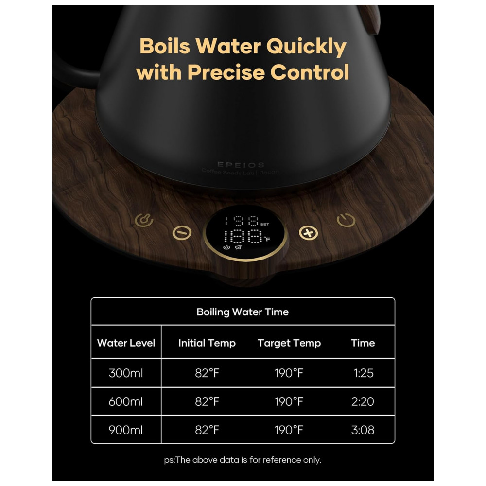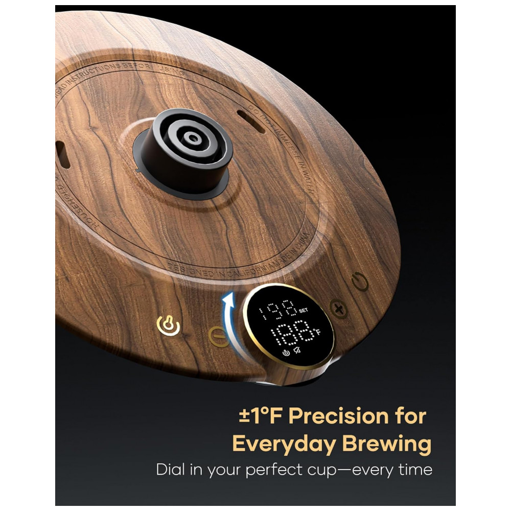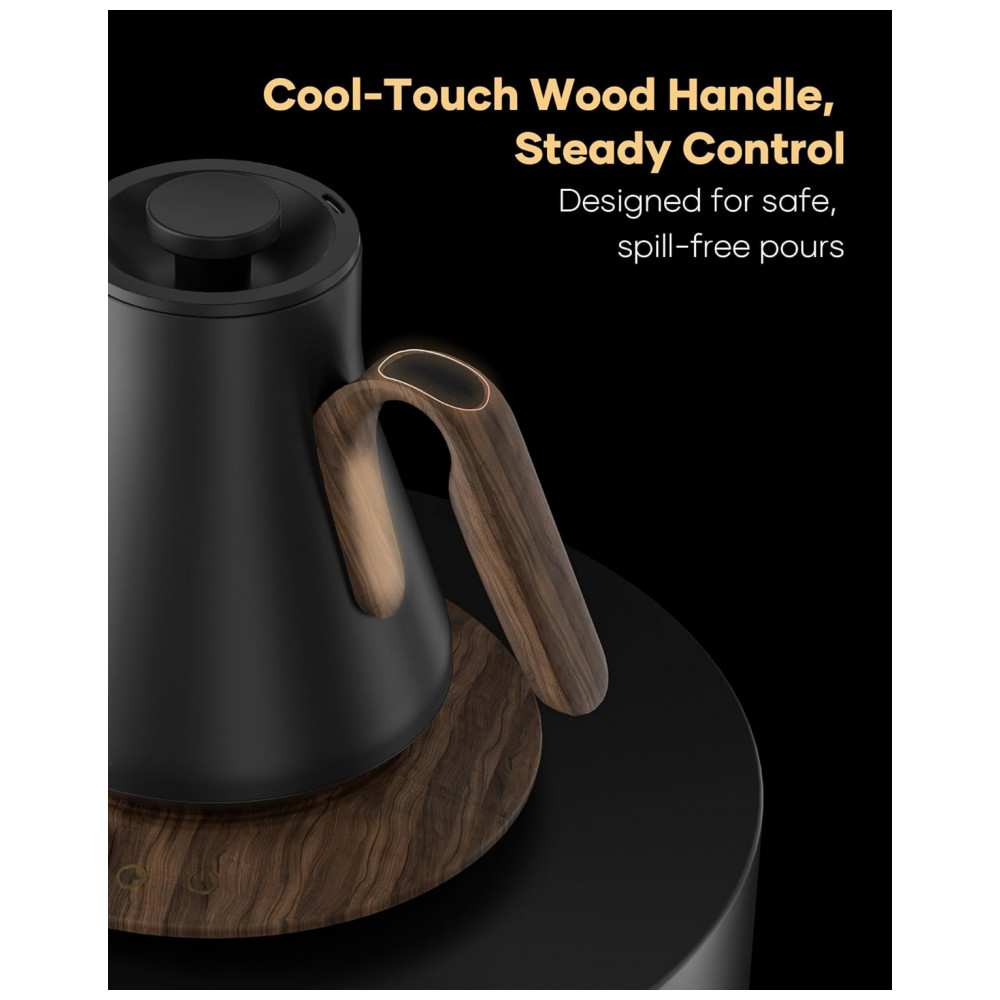 O bico em formato pescoço de ganso em S foi projetado para fluxo contínuo e controlado, favorecendo extrações filtradas consistentes. A base integra display digital de 1,42″ para ajuste de temperatura, visualização em tempo real e acesso ao timer de preparo, que auxilia no controle do tempo de extração. O acabamento Obsidian Black combina corpo metálico em preto fosco com design voltado a estações de café domésticas e ambientes dedicados a bebidas especiais.