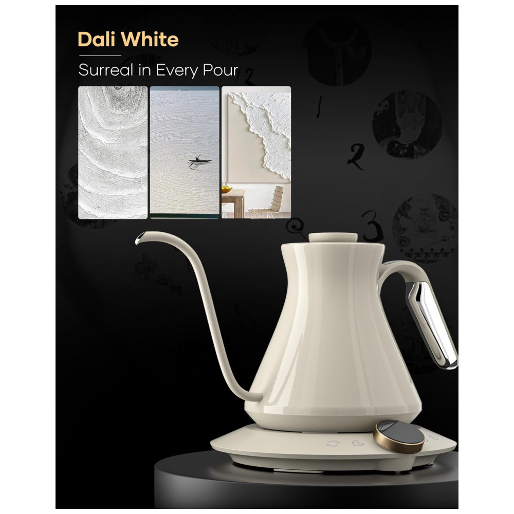 A chaleira elétrica Cocinare FLOW M6 Pro Dali foi projetada para preparo de café pour-over, chás e outras bebidas quentes com controle preciso de temperatura e fluxo de água em capacidade de 0,6 litro. O interior em aço inoxidável 304 em contato com a água é livre de BPA, indicado para uso diário em rotinas de preparo de bebidas quentes. O acabamento externo branco em alto brilho remete a porcelana, com visual limpo voltado a bancadas de cozinha e estações de café.