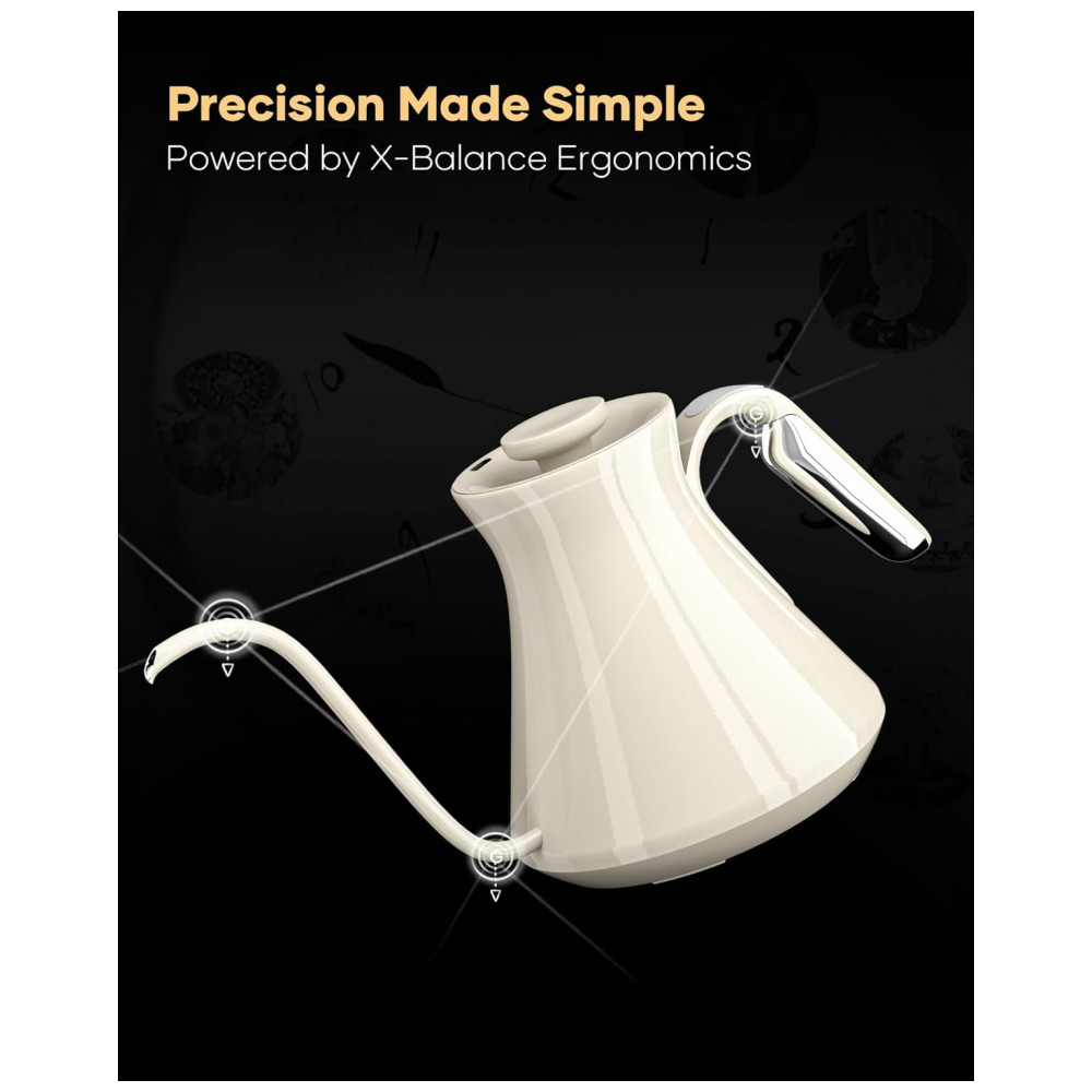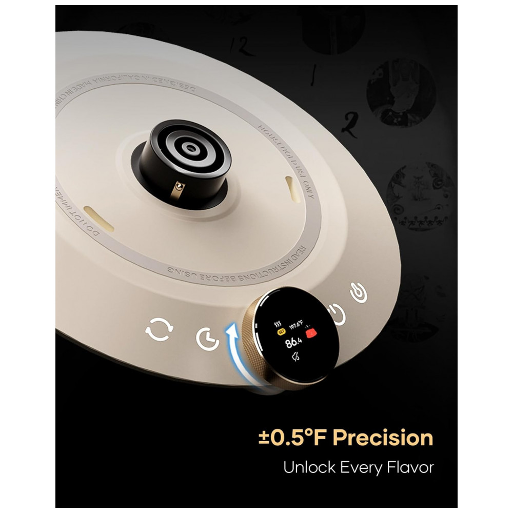 O sistema de aquecimento utiliza resistência elétrica de alta potência, aquecendo a água de forma rápida e mantendo-a próxima ao valor de temperatura selecionado. A chaleira conta com bico em formato pescoço de ganso com abertura de 6 mm, desenvolvido para fluxo contínuo e controlado em extrações filtradas. A base aquecedora inteligente incorpora tela colorida de 1,46 polegada para exibição de temperatura e ajustes de configuração, além de proteção contra fervura a seco e superaquecimento.