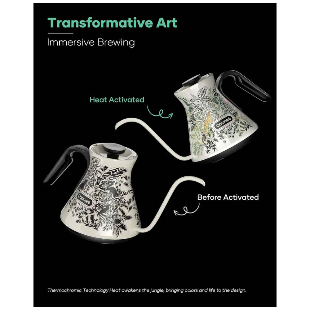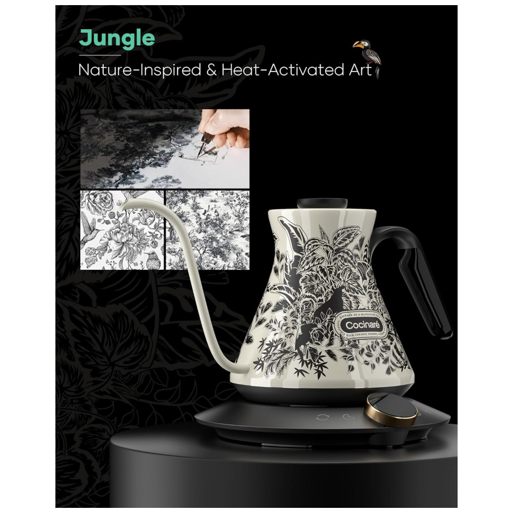 O bico em formato pescoço de ganso com saída de 6 mm favorece fluxo estável e controlado, adequado para extrações filtradas com maior precisão. O acabamento externo com ilustração Jungle em padrão que muda de cor com o aquecimento adiciona indicação visual durante o uso. A base aquecedora inteligente permite ajuste de temperatura em incrementos finos, mantendo a água dentro de uma faixa estreita ao longo do preparo.