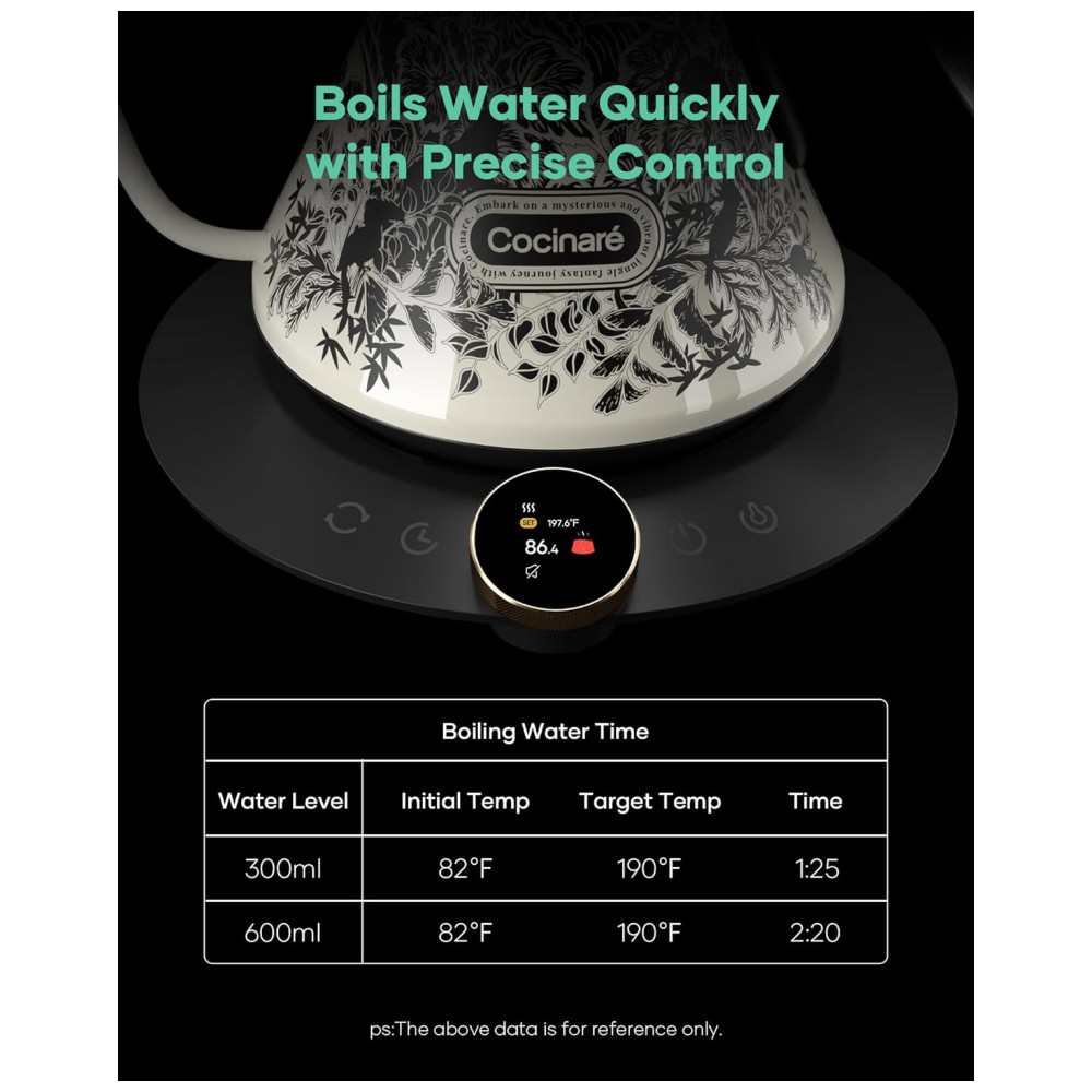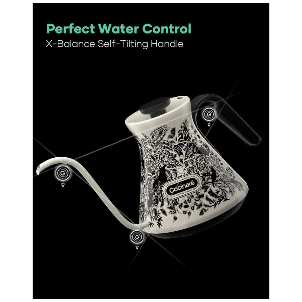 A chaleira elétrica Cocinare FLOW M6 Pro Jungle foi desenvolvida para preparo de café pour-over, chás e outras bebidas quentes com controle preciso de temperatura e fluxo de água. O corpo em aço inoxidável 304 em contato com a água é livre de BPA, indicado para uso diário em preparo de bebidas quentes. A capacidade de 0,6 litro atende rotinas individuais e pequenos serviços, com aquecimento rápido por resistência de até 1500W.