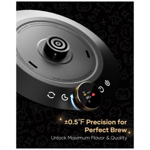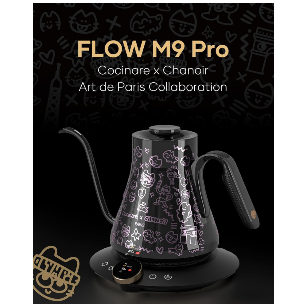 A chaleira elétrica Cocinare FLOW M9 Pro edição Chanoir Black foi desenvolvida para preparo de café e chá com controle preciso de temperatura e fluxo de água, combinando corpo em aço inoxidável 304 com acabamento preto e efeito metálico que muda de cor com o aquecimento. Com capacidade de 0,9 litro, atende métodos pour-over e demais técnicas que exigem vazão estável, permitindo ajuste fino da temperatura no painel com display digital e botão giratório. O bico em formato pescoço de ganso em S proporciona fluxo contínuo e controlado, favorecendo extrações consistentes em cafés filtrados e infusões especiais.
