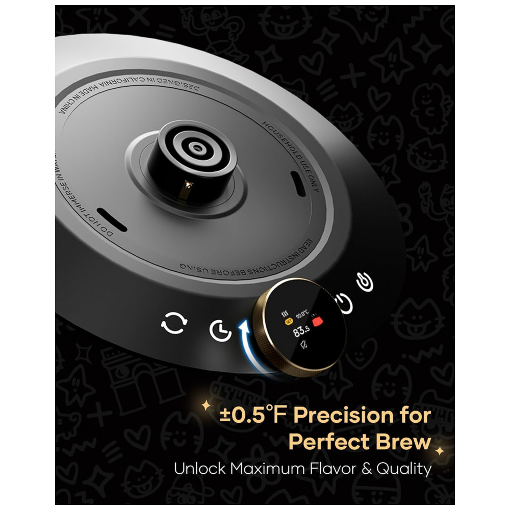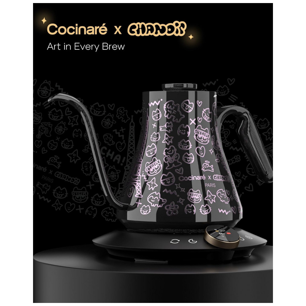 A base inteligente integra resistência elétrica de 1200W, funções de aquecimento rápido e manutenção da temperatura por período prolongado, além de temporizador para acompanhar o tempo de extração. A construção interna em aço inoxidável em contato com a água e materiais livres de BPA contribui para preservar o sabor das bebidas e facilitar a limpeza com processos de descalcificação periódicos. O conjunto inclui embalagem do tipo gift box e tapete de café colecionável, mantendo o foco em uso funcional com identidade visual da colaboração com o artista Chanoir.