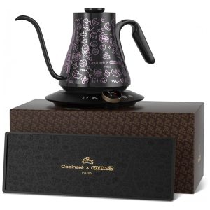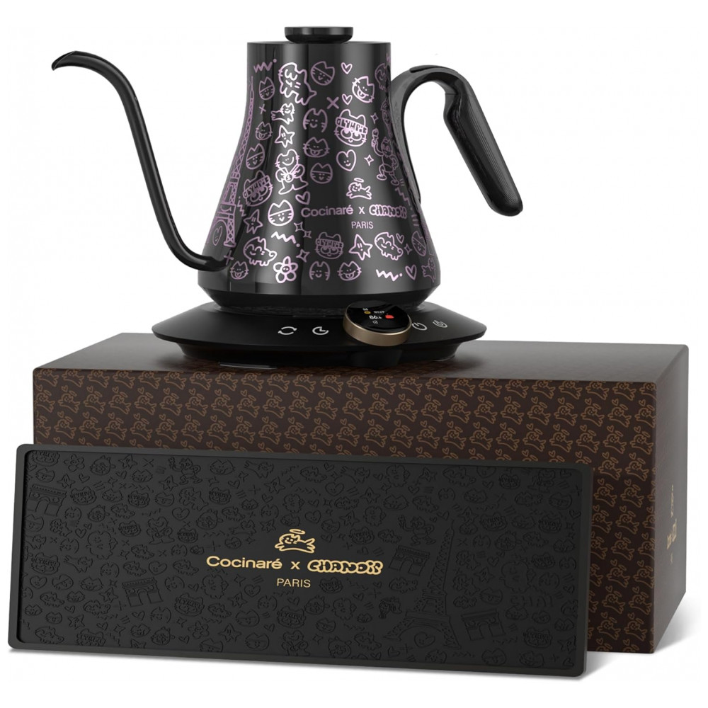 Conteúdo da embalagem: Chaleira elétrica Cocinare FLOW M9 Pro Chanoir, base inteligente, tapete de café colecionável, caixa de apresentação, manual do usuário, cartão de garantia