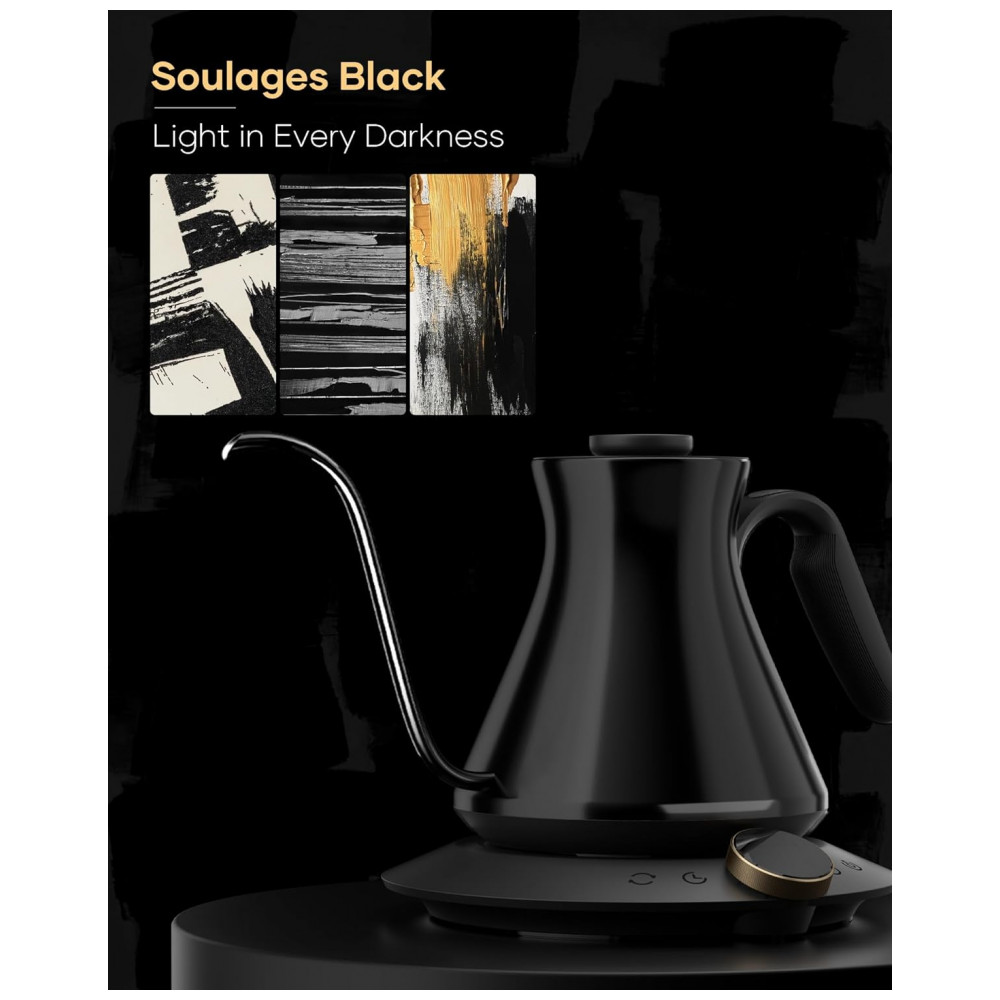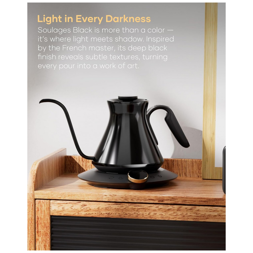 A chaleira elétrica Cocinare Soulagues FLOW M6 Pro foi desenvolvida para preparo de café pour-over, chás e outras bebidas quentes com controle preciso de temperatura e fluxo de água em capacidade de 0,6 litro. O interior em aço inoxidável 304 em contato com a água é livre de BPA, adequado para uso diário em rotinas de preparo de bebidas quentes. O acabamento externo em preto Soulages com brilho sutil utiliza revestimento de alto padrão, projetado para realçar textura e reflexos sob diferentes condições de luz.