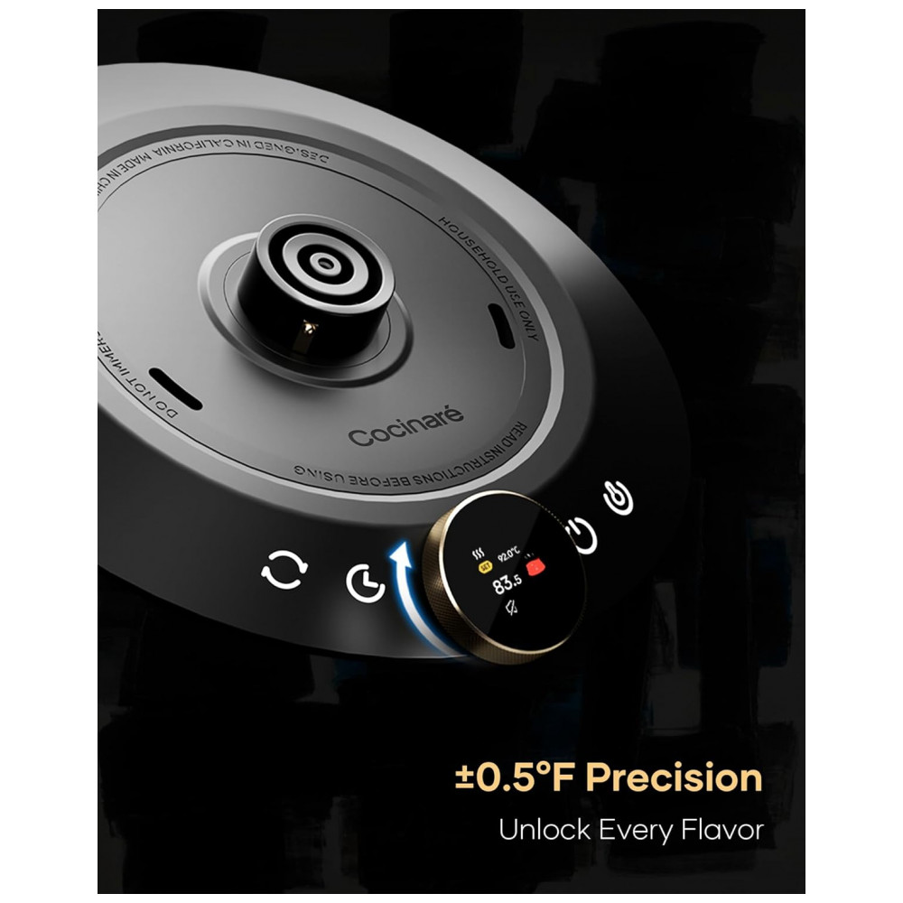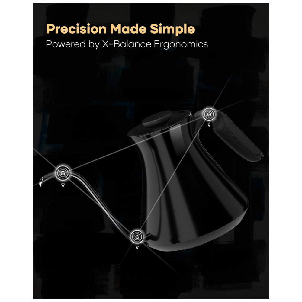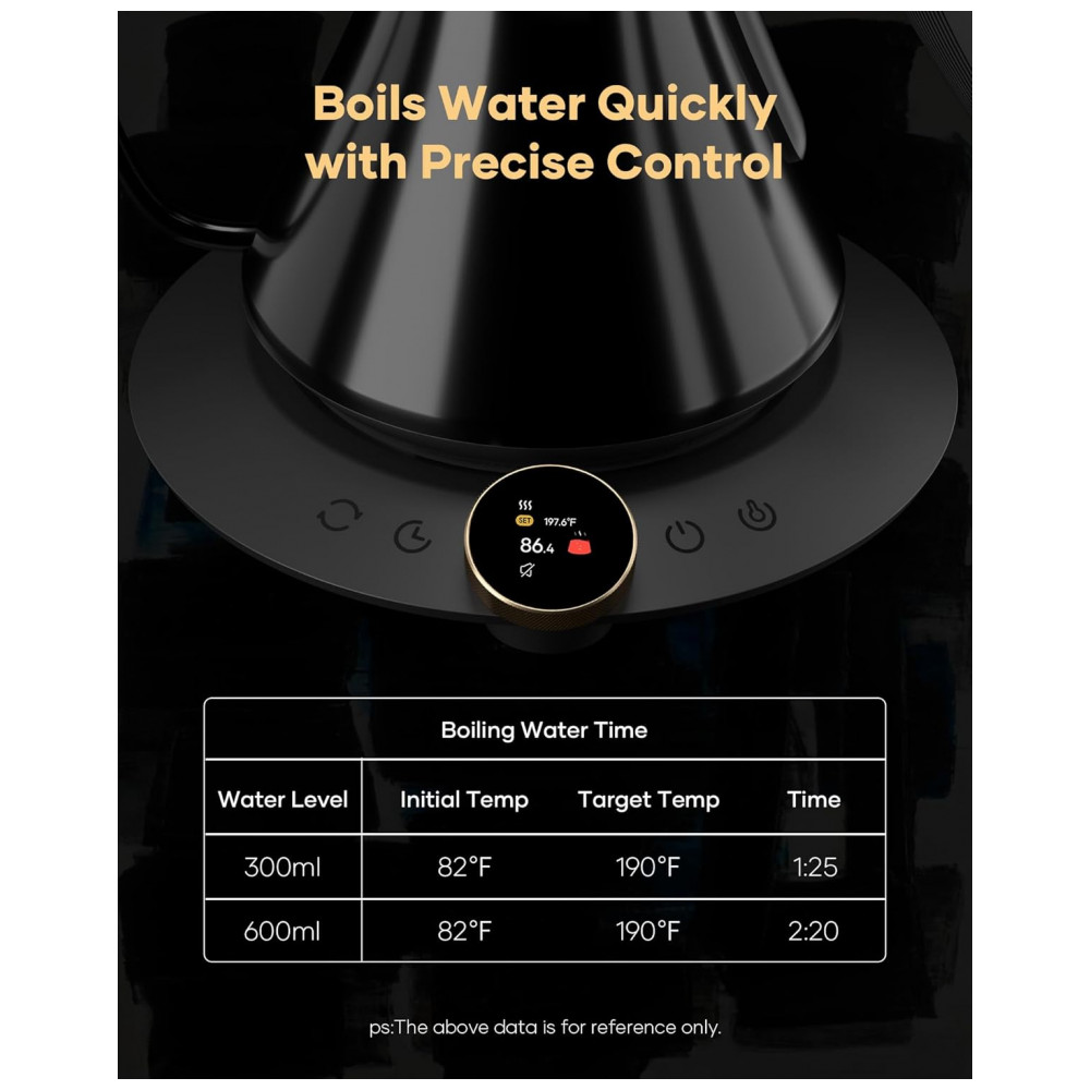 O sistema de aquecimento rápido trabalha com resistência elétrica de alta potência e controle eletrônico, mantendo a água próxima ao valor de temperatura definido. A chaleira utiliza bico em formato pescoço de ganso com abertura de 6 mm para fluxo contínuo e controlado, favorecendo extrações filtradas com maior precisão. A base aquecedora inteligente incorpora tela colorida de 1,46 polegada para exibição de temperatura e ajustes de configuração, além de recursos de segurança para proteção contra fervura a seco e superaquecimento.