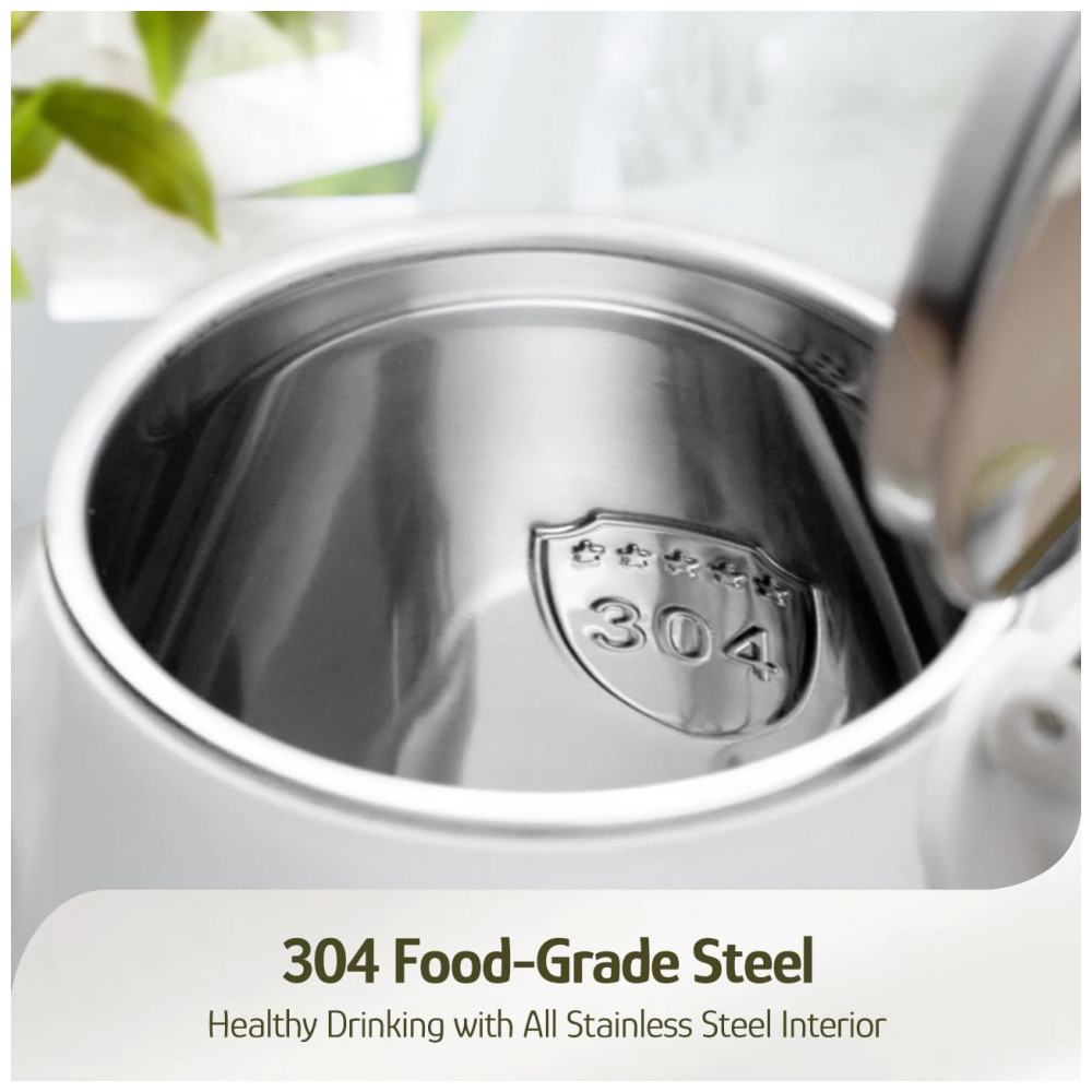A chaleira elétrica Hazel Quinn Pearl White 1L foi desenvolvida para uso individual ou em pequenos ambientes, com capacidade de 1 litro e aquecimento rápido por elemento de 800W, suficiente para ferver uma xícara em cerca de 2–3 minutos ou o volume total em 4–5 minutos. O corpo interno é totalmente construído em aço inoxidável 304 de grau alimentar (jarro e tampa), sem contato de plástico com a água, e a estrutura de parede dupla gera isolamento térmico que mantém o exterior em temperatura mais baixa ao toque e ajuda a conservar a água quente por mais tempo.