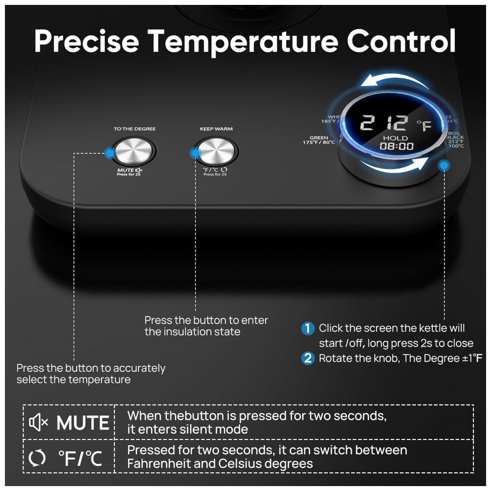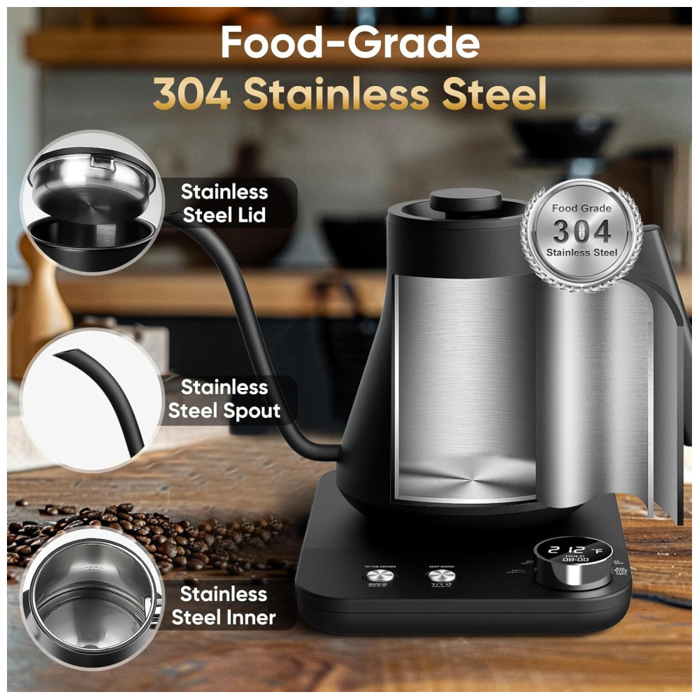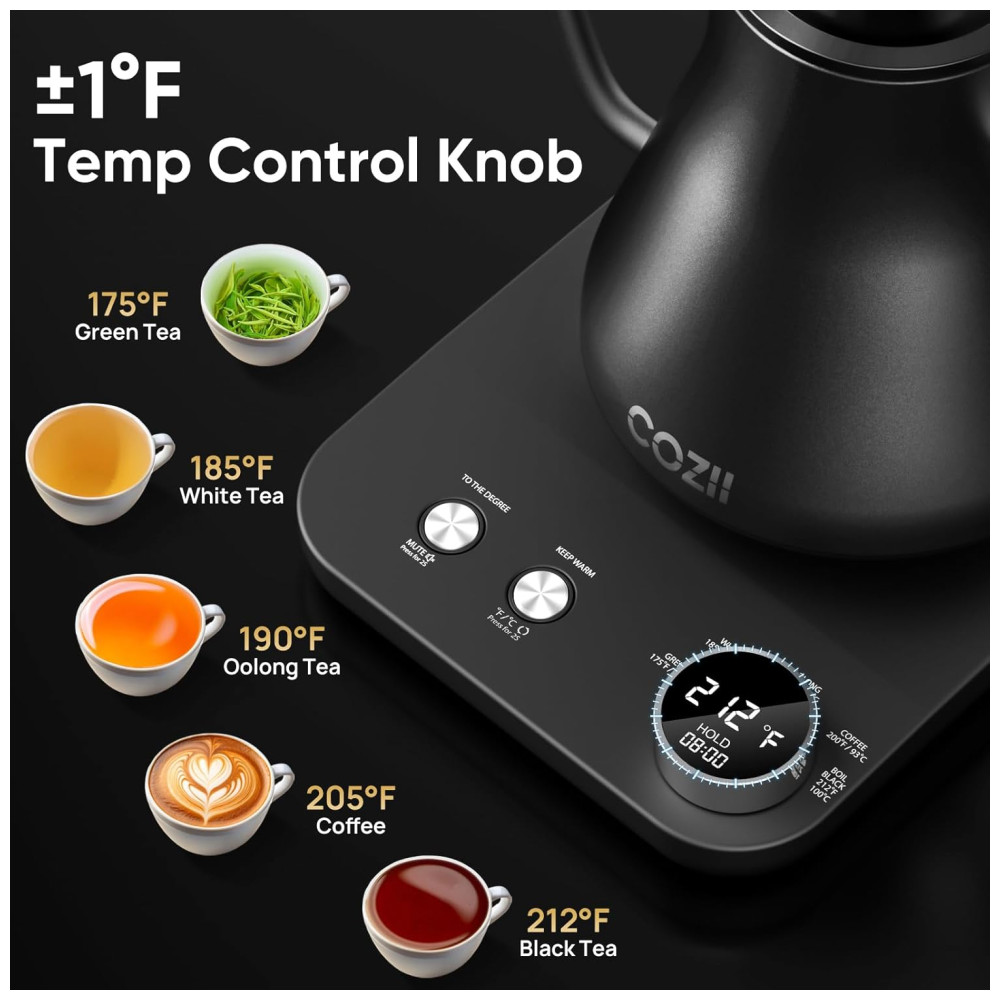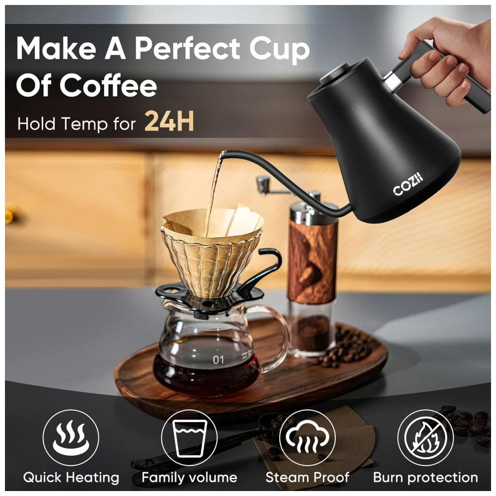 A chaleira elétrica COZII Gooseneck é ideal para quem busca precisão na hora de preparar café ou chá. Com controle de temperatura ajustável de 175 a 212 graus, você pode realçar os sabores e aromas de cada bebida. Possui display LCD, botão de ajuste de temperatura, função de manter aquecido por 24 horas e desligamento automático. Feita em aço inoxidável 304, seu design elegante com bico de ganso permite um fluxo de água controlado. Além disso, aquece rapidamente com 1200W de potência e inclui 50 filtros de café para sua comodidade.