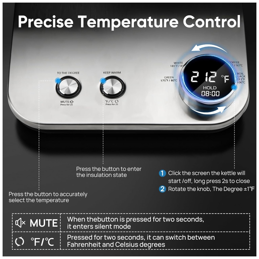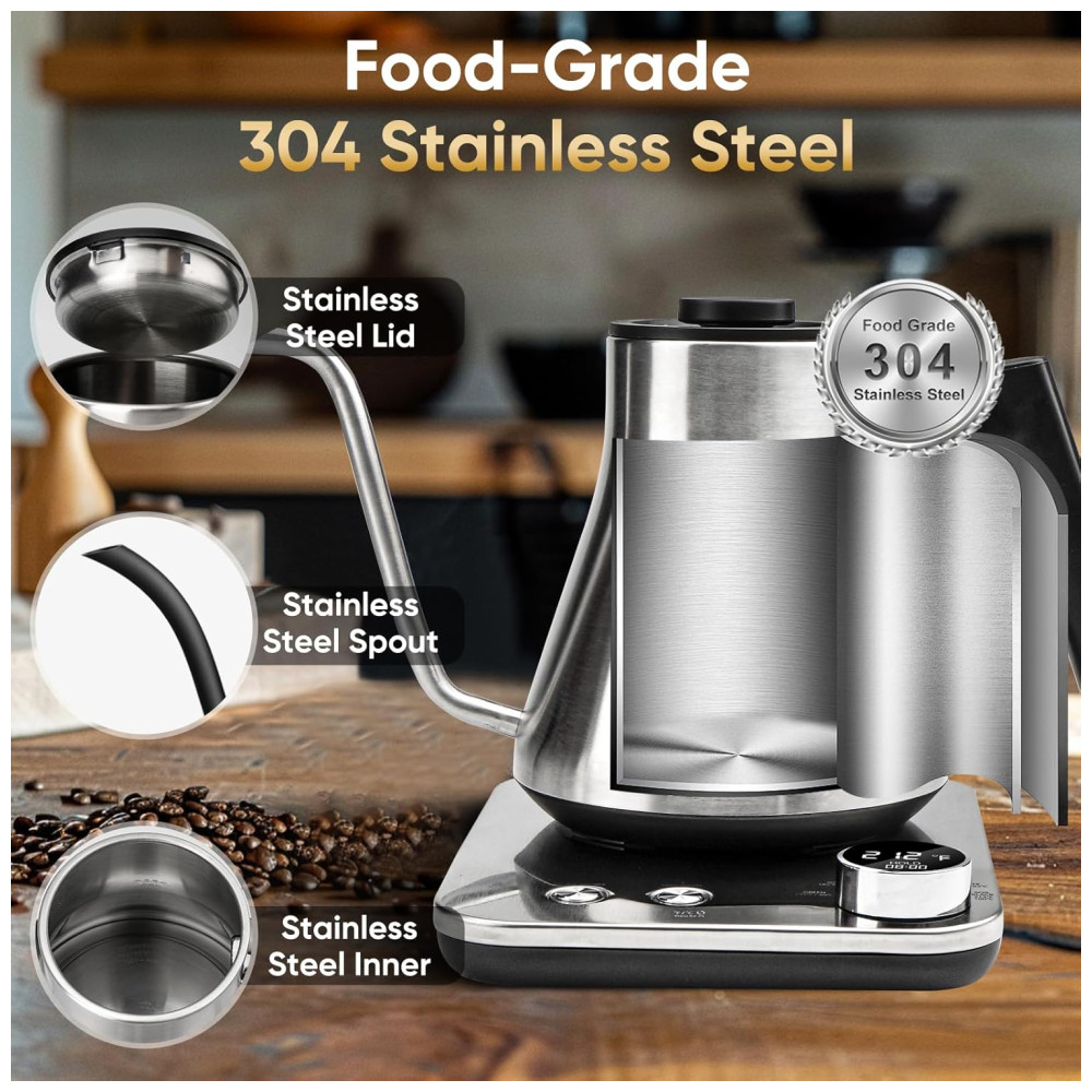 A chaleira elétrica COZII Gooseneck é perfeita para os amantes de café e chá mais exigentes! Com controle de temperatura ajustável de 175 a 212, você pode preparar sua bebida na temperatura ideal, realçando sabores e aromas. Aquecimento rápido de 1200W e função de manutenção de calor por 24 horas. Design durável em aço inoxidável 304, bico de ganso para despejo preciso e alça equilibrada. Não perca a chance de ter uma experiência conveniente e excepcional!