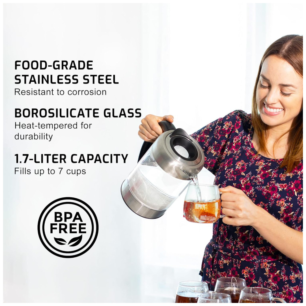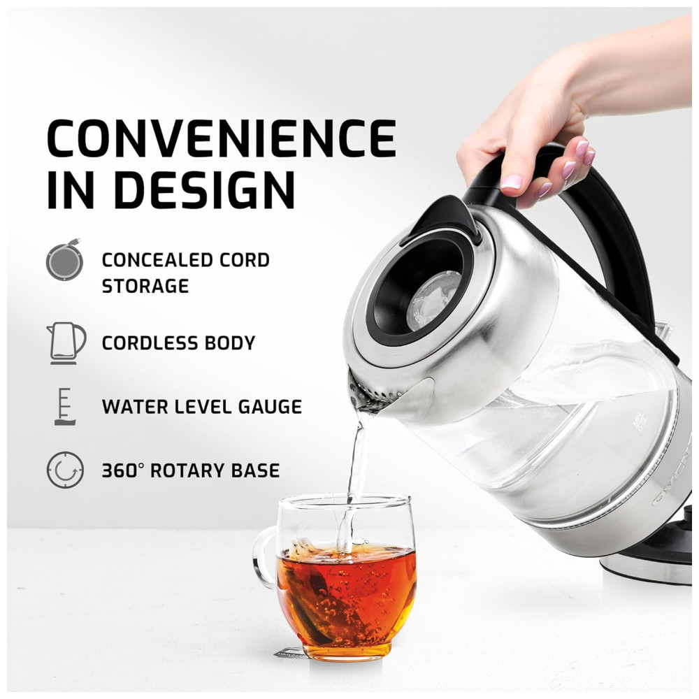 Sofisticado possui um halo de luzes LED azuis que iluminam a panela quando está em uso, tornando a uma peça elegante tanto na bancada da cozinha quanto na mesa de jantar. Devido ao seu design moderno, você não precisará de outra garrafa térmica ou jarro. Você pode usar a chaleira direto da cozinha para a mesa de jantar A chaleira parece elegante mesmo quando as luzes LED estão apagadas.