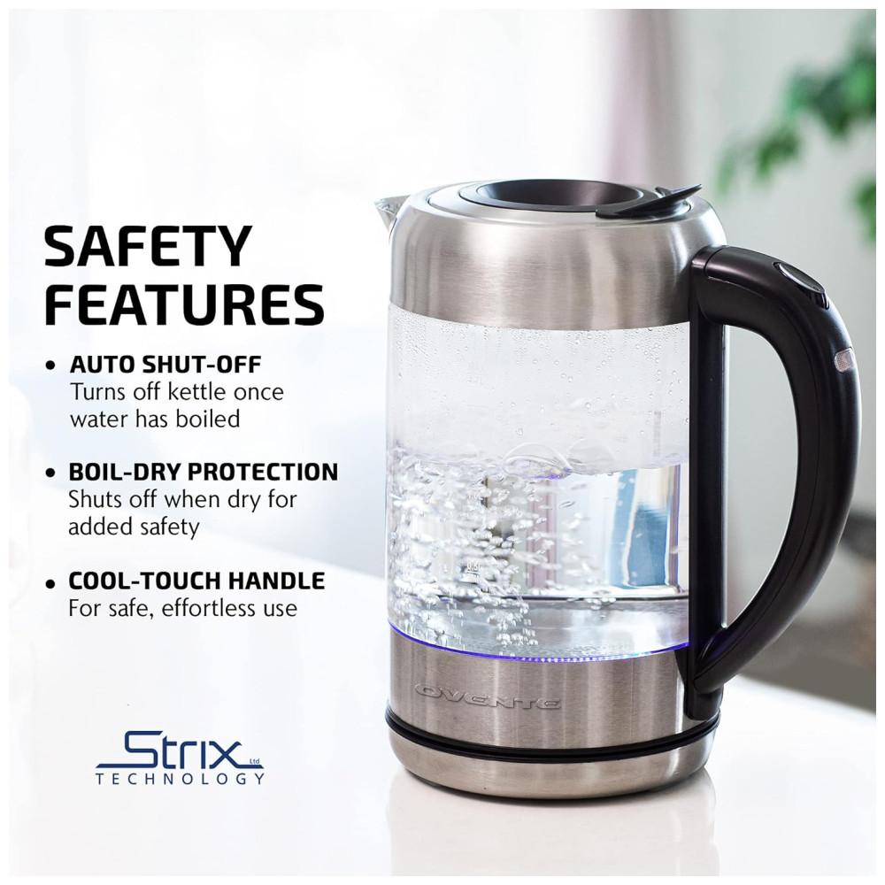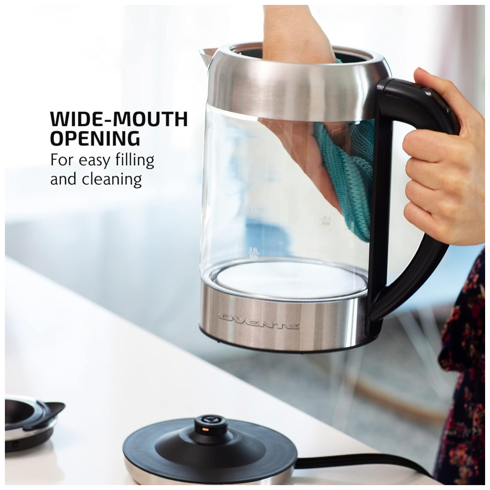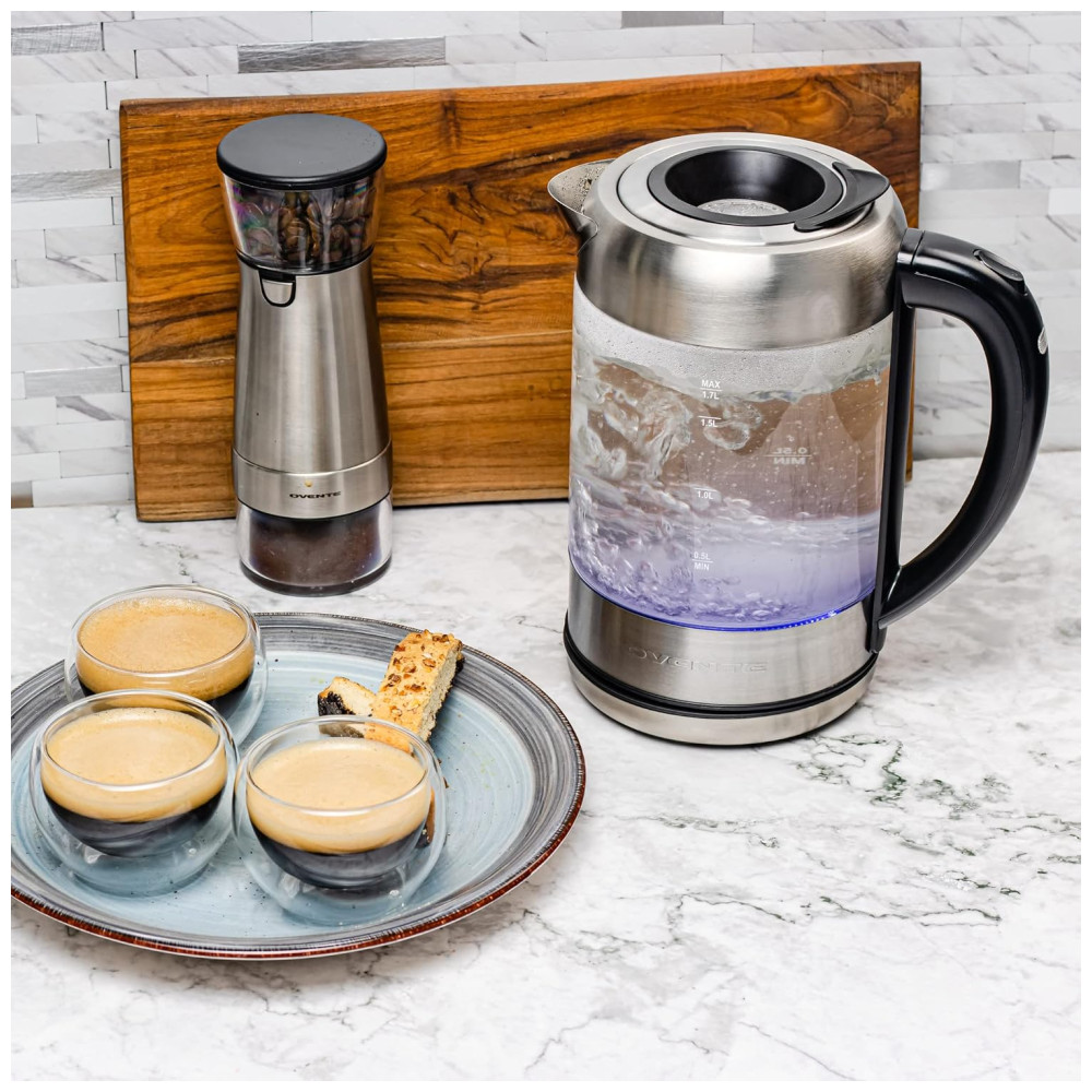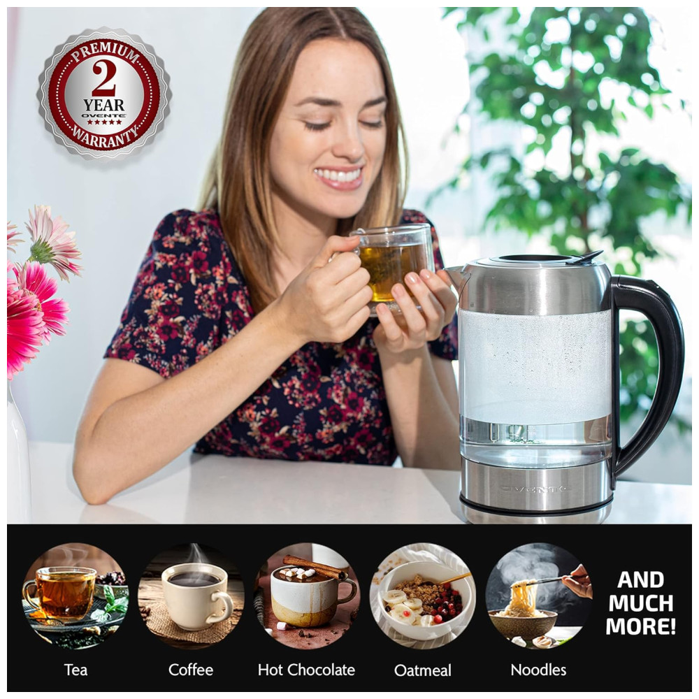 Água fervente num piscar de olhos Obtenha água bem quente duas vezes mais rápido do que outras chaleiras de fogão tradicionais A Chaleira Elétrica Ovente Série KG612S é alimentada por 1500 W 120 V e ferve uma panela cheia de 1,7 litros de água em 7 minutos ou menos. É 50 mais eficiente do que outras chaleiras de fogão na redução do uso diário de eletricidade.