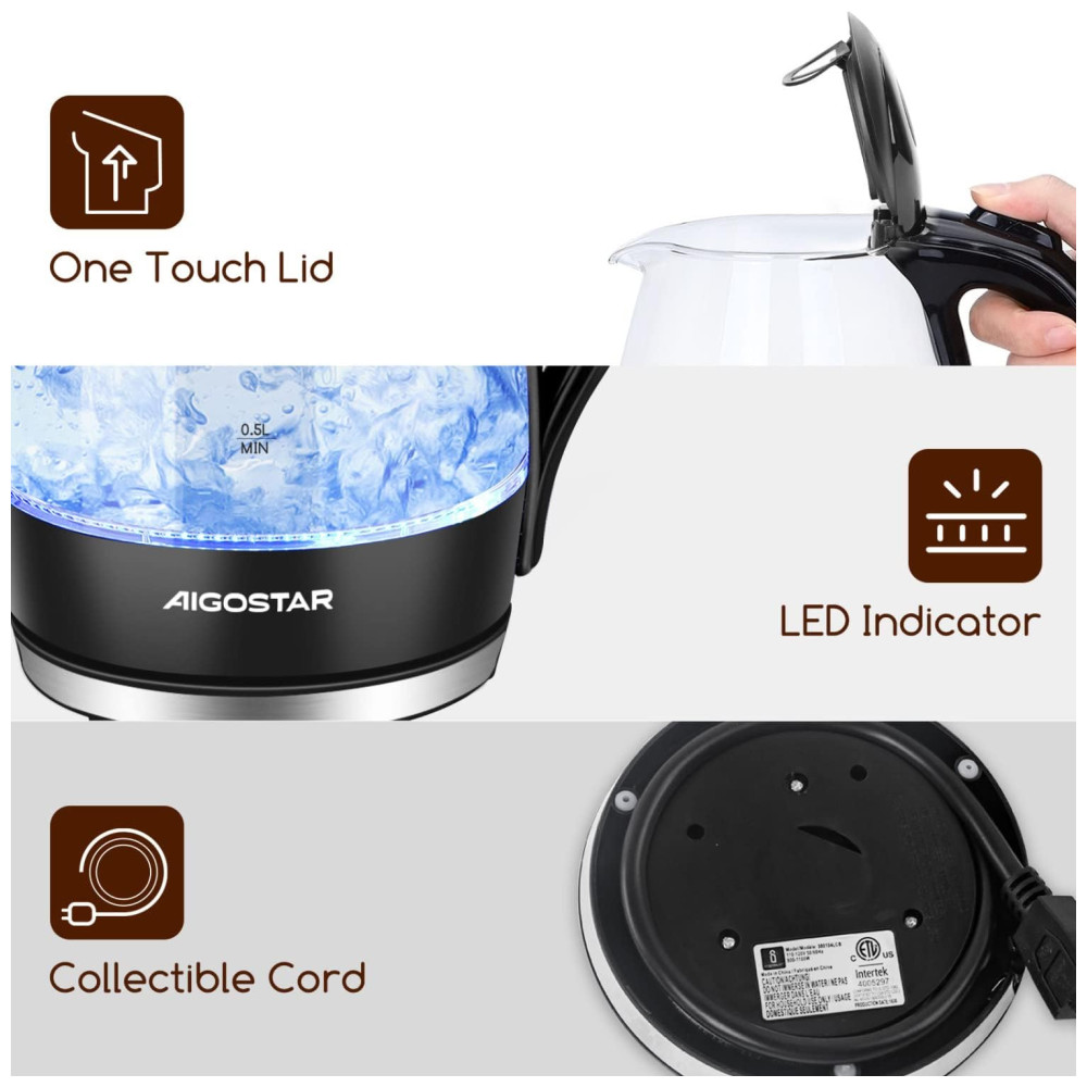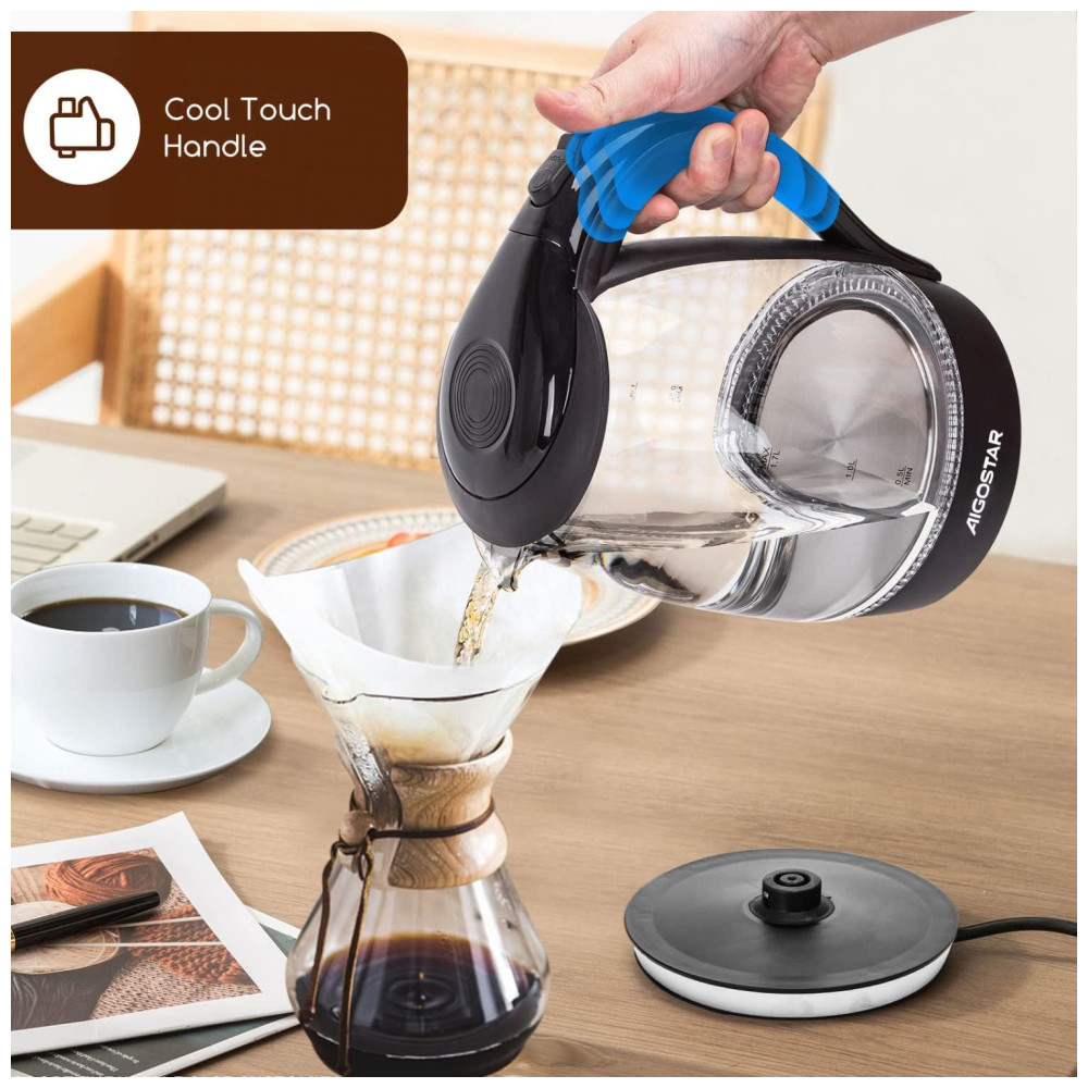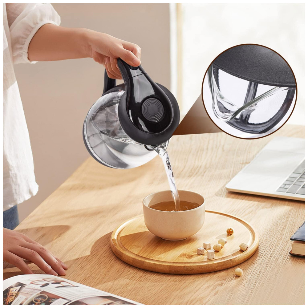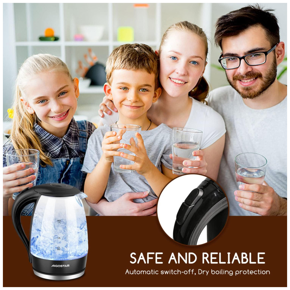 Cuide da sua saúde Fabricado em vidro de alta qualidade, esta chaleira elétrica de vidro é durável e resistente a manchas. Todos os lugares desta chaleira em contato com a água são materiais de qualidade para preservar os sabores naturais e prevenir a contaminação do sabor.