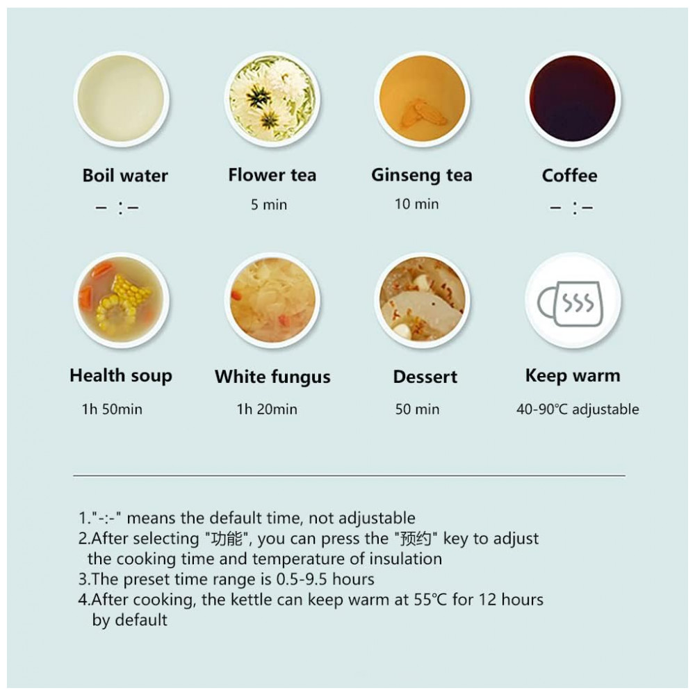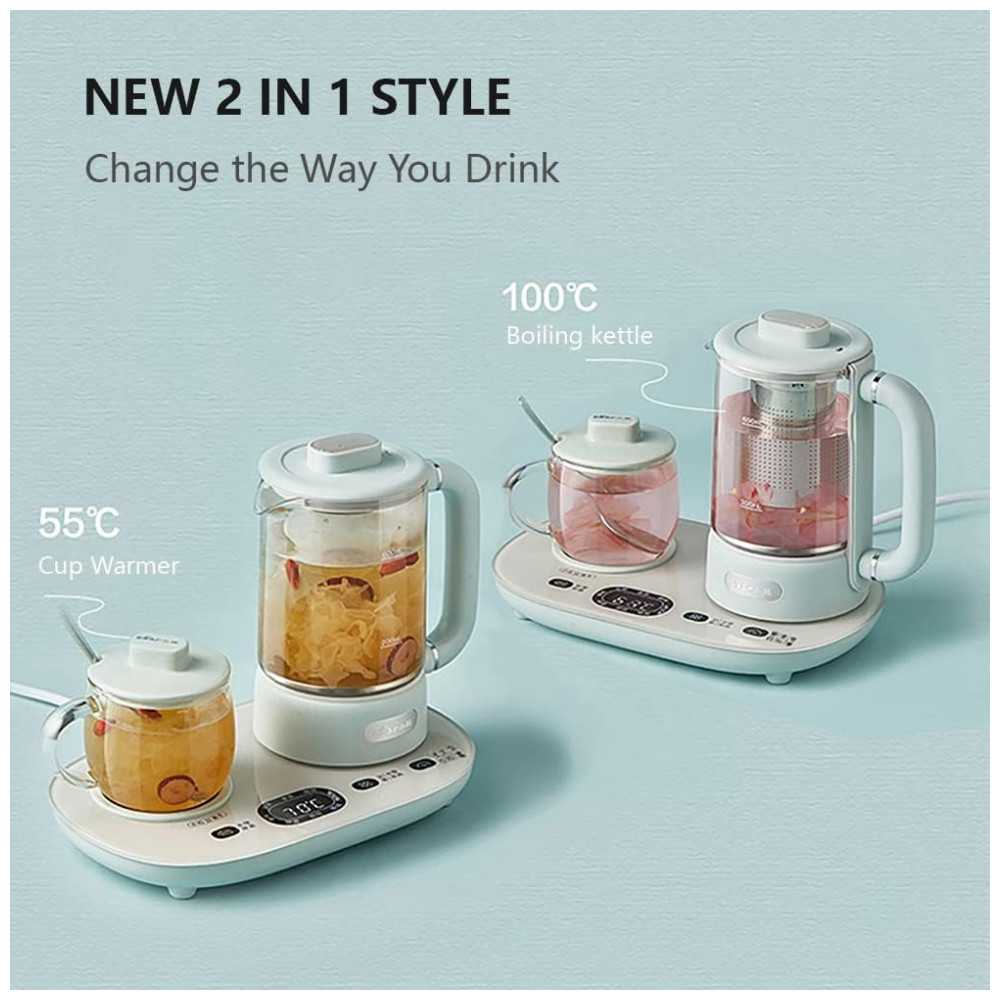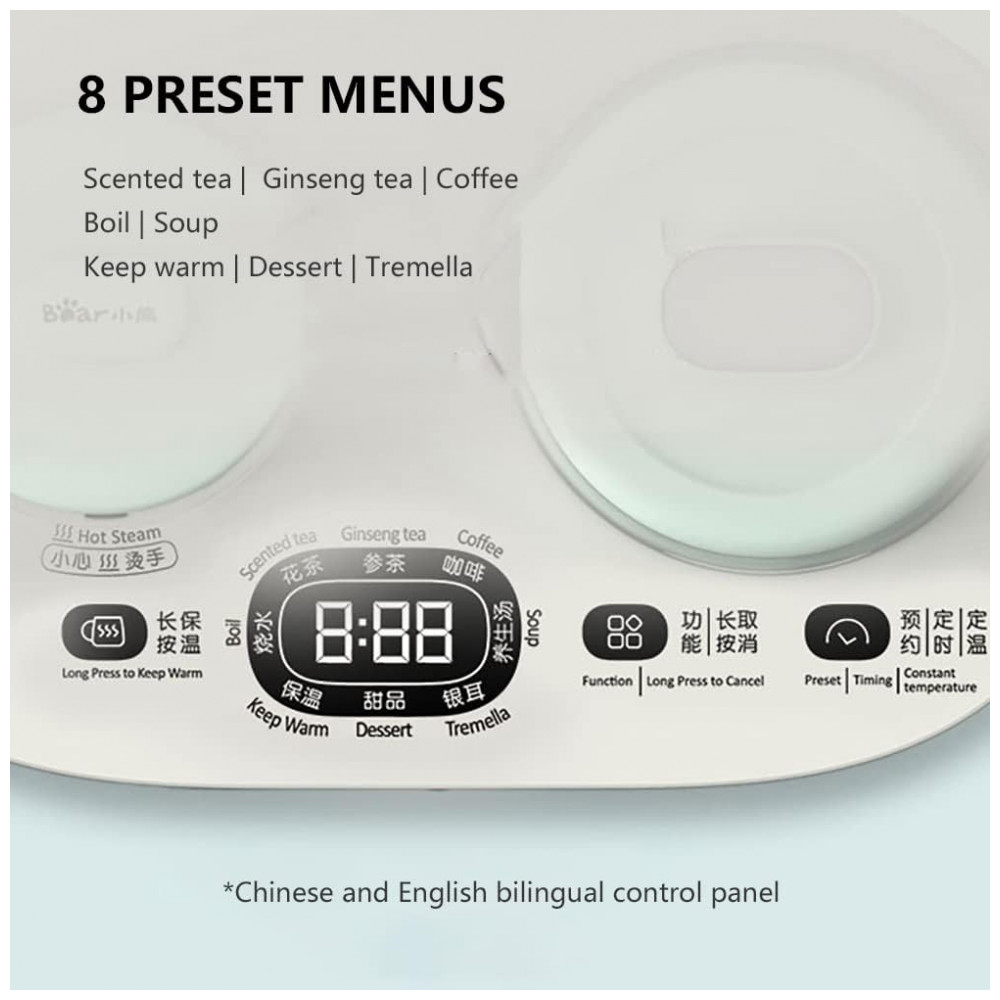 A chaleira elétrica Bear YSH-C06N1 integra função de infusor, controle de temperatura digital, aquecimento automático com painel em vidro temperado e cup warmer compatível com recipientes de 300 ml. O recipiente principal, em vidro borossilicato de alta resistência, possui capacidade máxima de 600 ml e permite fervura da água acima de 100 °C, além de função manter aquecido entre 40 °C e 90 °C, com ajuste em 11 níveis distintos e tempo de até 12 horas de aquecimento contínuo. O dispositivo conta com 8 menus programáveis, memória de levantamento do recipiente por 6 minutos, temporizador com pré-programação de até 9,5 horas e display de temperatura em Celsius. Inclui infusor em aço inox 304 e tampa de cerâmica para o recipiente auxiliar. Indicado para preparo de chás, café, sopas leves e aquecimento de leite ou outras bebidas quentes em pequenas porções.