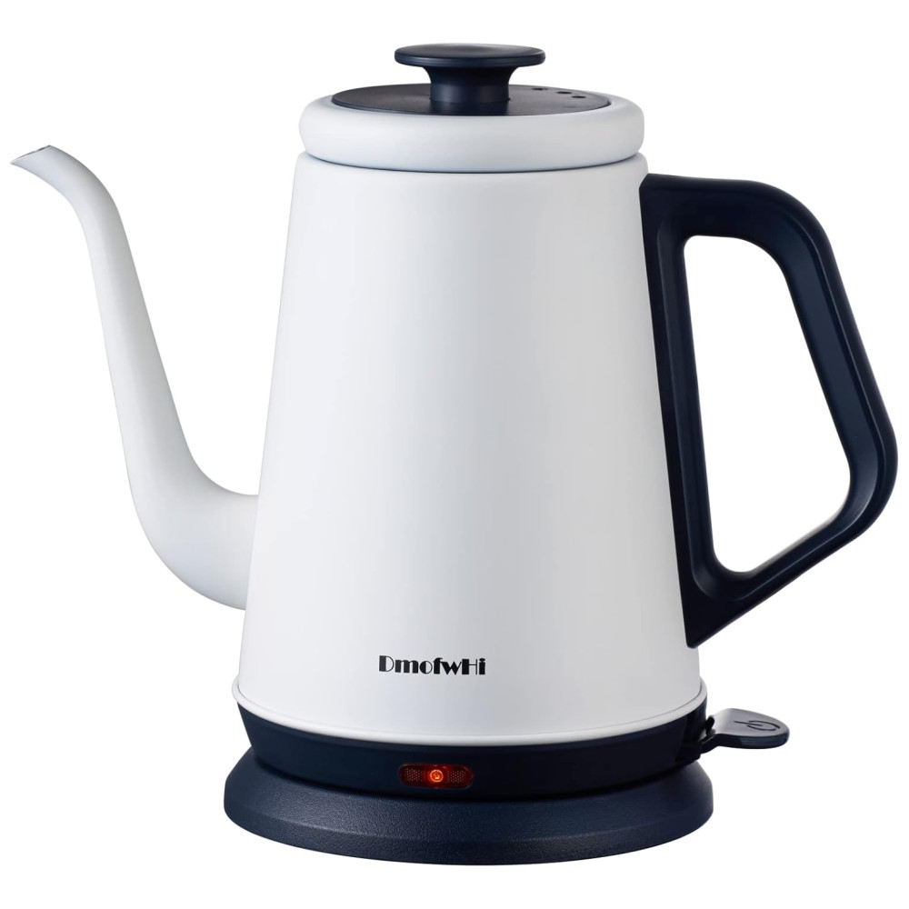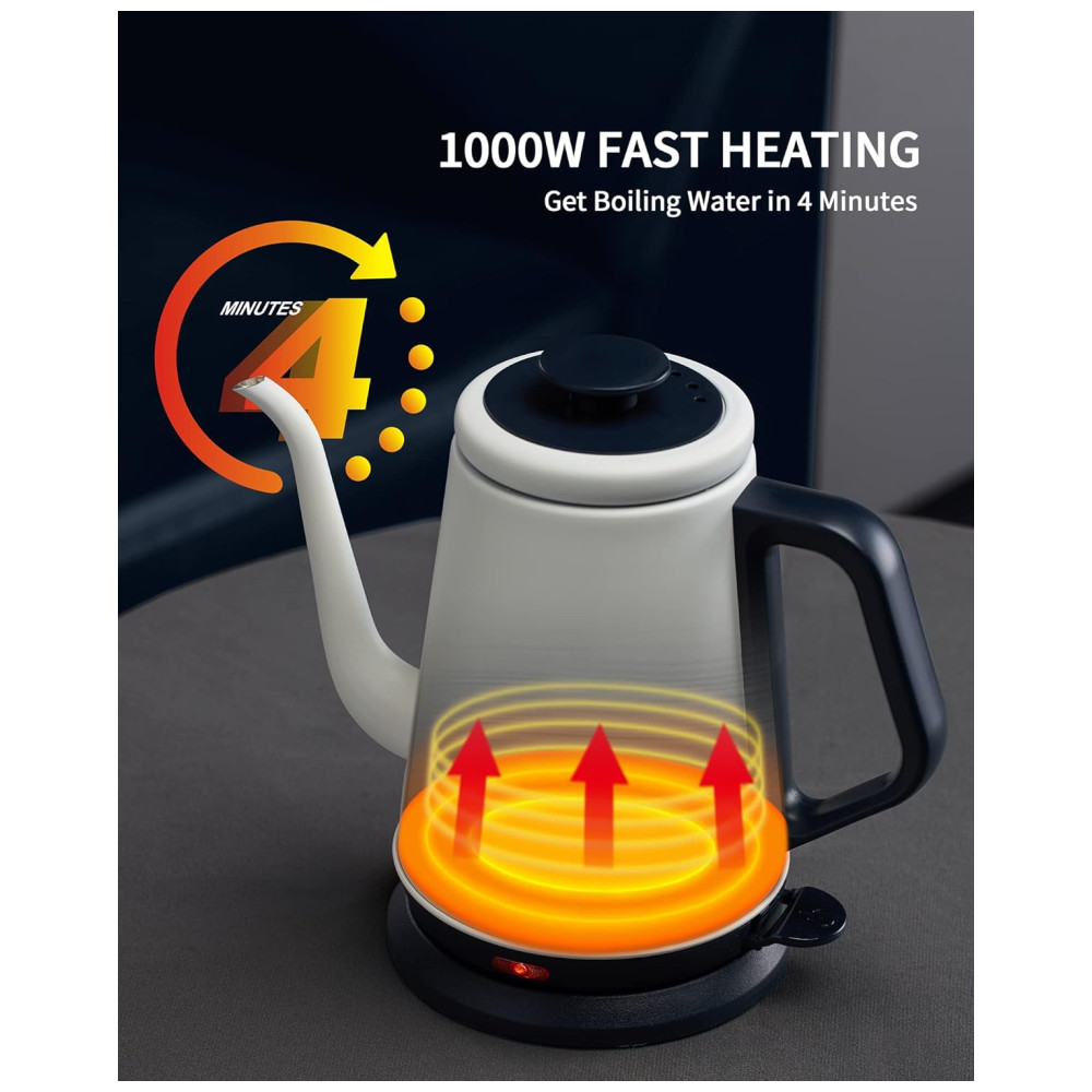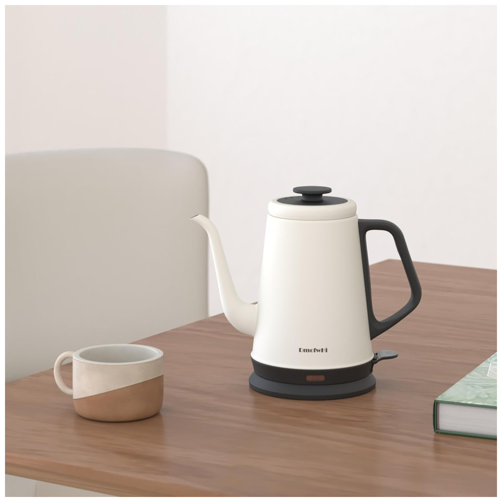 Controle suave e preciso na hora de despejar~ A chaleira elétrica gooseneck da DmofwHi vem com um bico de ganso de 0,8mm que oferece máximo controle da vazão da água. A alça antiderrapante da chaleira elétrica se destaca pela ergonomia, sendo firme e confortável para segurar e deslocar o centro de massa mais próximo da sua mão ao despejar água quente. A chaleira de café DmofwHi vai te ajudar a extrair melhores sabores do café moído, resultando em uma xícara de café mais saborosa. Aço inoxidável de grau alimentício para água pura~ A chaleira elétrica gooseneck é feita inteiramente de aço inoxidável 304 de grau alimentício, incluindo o interior, tampa e bico, garantindo o sabor puro da água para você. Além disso, as chaleiras de água quente possuem uma construção robusta e bem feita para servir a longo prazo. 1000 Watts para Aquecimento Rápido~ Esta chaleira elétrica de chá se destaca por aquecer a água de forma silenciosa e rápida. A chaleira levará cerca de 5 minutos para ferver a água até a capacidade máxima. A água ferve com apenas um toque de botão, permitindo que você desfrute de um café ou chá quente de manhã sem complicações. Por favor, tenha cuidado para não tocar na superfície da chaleira elétrica ao aquecer. Desligamento Automático Quando a Água Ferve~ A chaleira elétrica para ferver água está equipada com proteção contra fervura seca e um recurso avançado de desligamento eletrônico que ativa assim que a água ferve. Além disso, esta chaleira elétrica também irá parar automaticamente de funcionar quando não houver água dentro e voltar ao modo pronto após esfriar. A tampa deve estar fechada ao aquecer a água. Chaleira de Água Elegante de 1,0L com Bico de Ganso na sua Cozinha~ Em termos de capacidade, a chaleira elétrica de água possui um bom tamanho de 1,0L para a maioria das tarefas de despejo na vida: café coado, chá verde, oolong, leite e água fervida. A chaleira pode ser facilmente retirada da base de aquecimento estável. O design sem fio torna a chaleira elétrica ideal para qualquer ocasião. Você pode armazenar sua chaleira de café coado de forma bonita e organizada agrupando o cabo na base de aquecimento.
