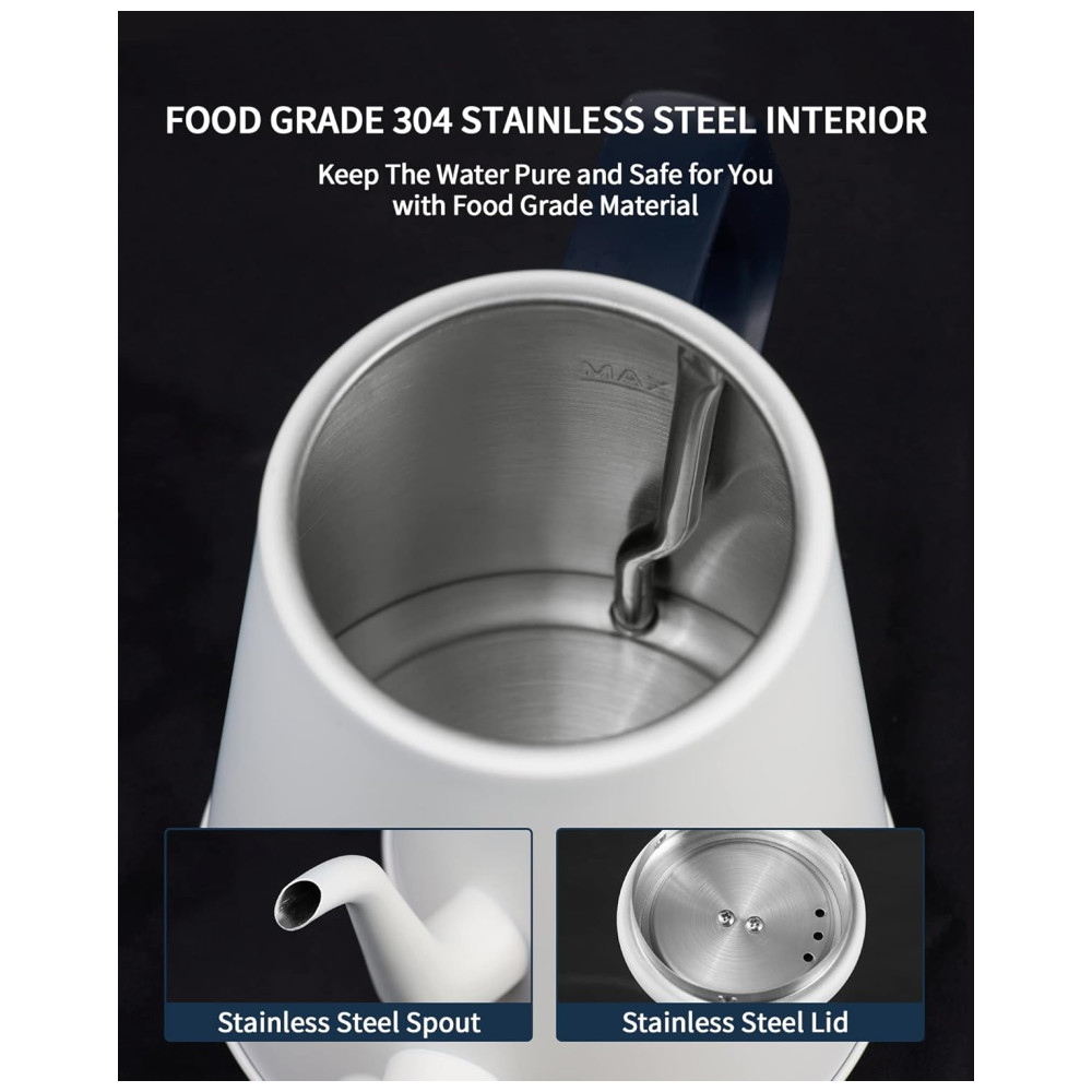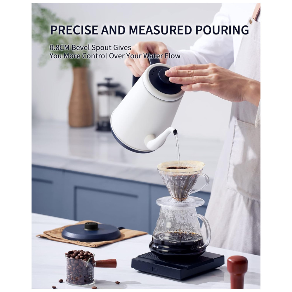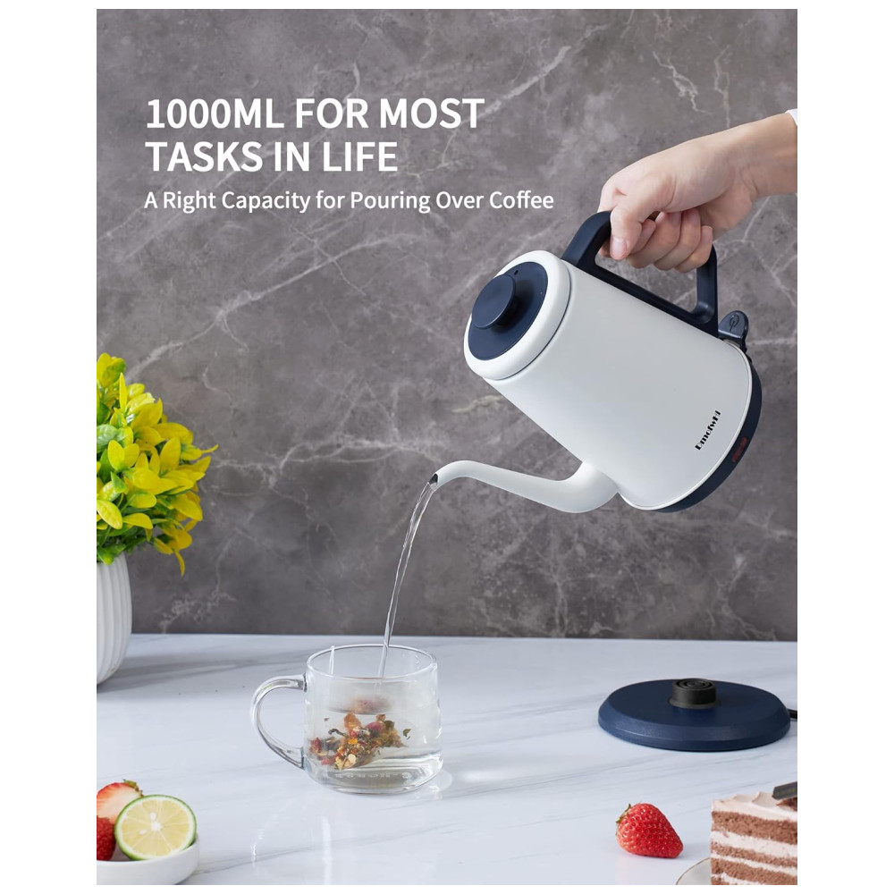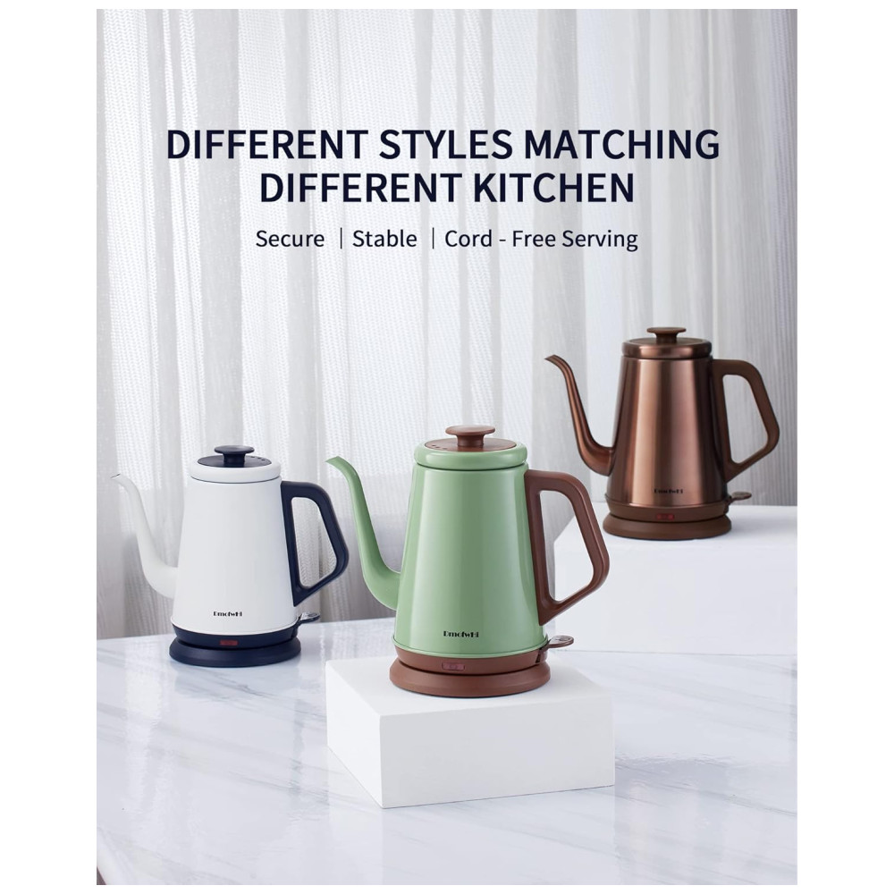 Controle suave e preciso na hora de despejar~ A chaleira elétrica gooseneck da DmofwHi vem com um bico de ganso de 0,8mm que oferece máximo controle da vazão da água. A alça antiderrapante da chaleira elétrica se destaca pela ergonomia, sendo firme e confortável para segurar e deslocar o centro de massa mais próximo da sua mão ao despejar água quente. A chaleira de café DmofwHi vai te ajudar a extrair melhores sabores do café moído, resultando em uma xícara de café mais saborosa. Aço inoxidável de grau alimentício para água pura~ A chaleira elétrica gooseneck é feita inteiramente de aço inoxidável 304 de grau alimentício, incluindo o interior, tampa e bico, garantindo o sabor puro da água para você. Além disso, as chaleiras de água quente possuem uma construção robusta e bem feita para servir a longo prazo. 1000 Watts para Aquecimento Rápido~ Esta chaleira elétrica de chá se destaca por aquecer a água de forma silenciosa e rápida. A chaleira levará cerca de 5 minutos para ferver a água até a capacidade máxima. A água ferve com apenas um toque de botão, permitindo que você desfrute de um café ou chá quente de manhã sem complicações. Por favor, tenha cuidado para não tocar na superfície da chaleira elétrica ao aquecer. Desligamento Automático Quando a Água Ferve~ A chaleira elétrica para ferver água está equipada com proteção contra fervura seca e um recurso avançado de desligamento eletrônico que ativa assim que a água ferve. Além disso, esta chaleira elétrica também irá parar automaticamente de funcionar quando não houver água dentro e voltar ao modo pronto após esfriar. A tampa deve estar fechada ao aquecer a água. Chaleira de Água Elegante de 1,0L com Bico de Ganso na sua Cozinha~ Em termos de capacidade, a chaleira elétrica de água possui um bom tamanho de 1,0L para a maioria das tarefas de despejo na vida: café coado, chá verde, oolong, leite e água fervida. A chaleira pode ser facilmente retirada da base de aquecimento estável. O design sem fio torna a chaleira elétrica ideal para qualquer ocasião. Você pode armazenar sua chaleira de café coado de forma bonita e organizada agrupando o cabo na base de aquecimento.