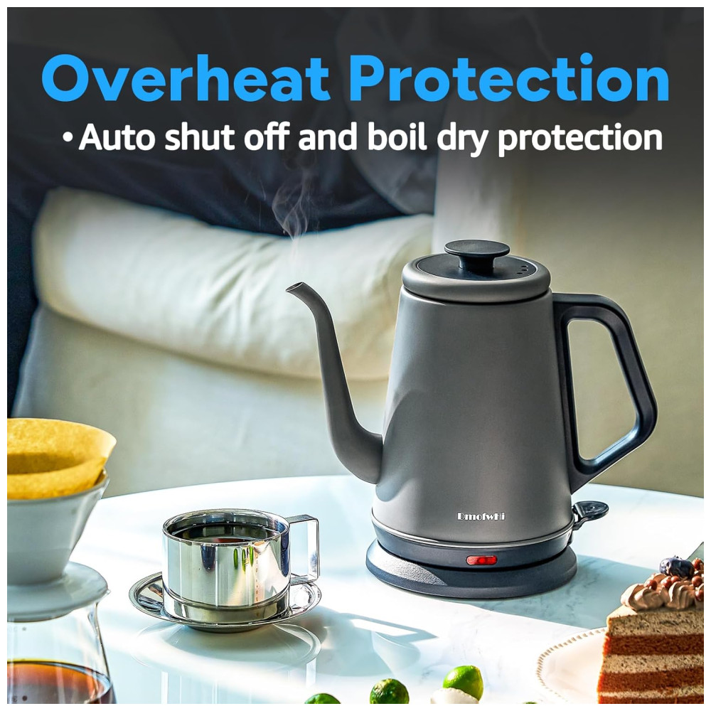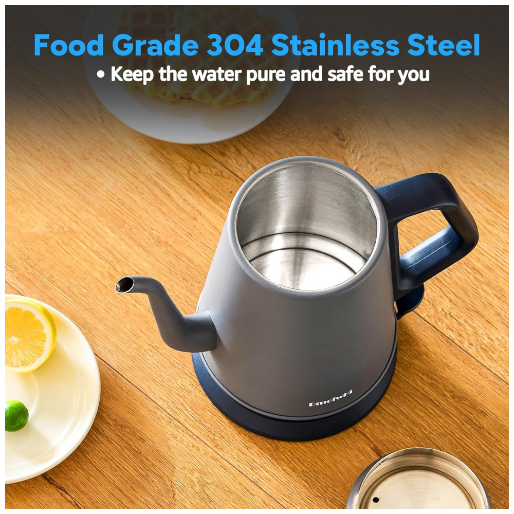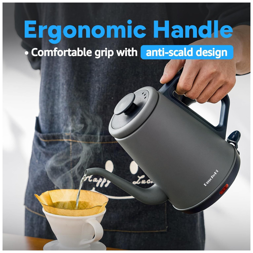 Desfrute de total controle no despejo preciso e controlado com a chaleira elétrica gooseneck da DmofwHi, equipada com bico de 0,8mm. O cabo antiderrapante e ergonômico oferece conforto ao segurar e deslocar o centro de massa mais próximo de sua mão ao despejar água quente. Feita totalmente em aço inoxidável 304 de qualidade alimentar, incluindo interior, tampa e bico, esta chaleira garante o sabor puro da água. Com 1000 watts de potência, esta chaleira aquece a água rapidamente e de forma silenciosa, desligando automaticamente ao ferver. Design elegante de 1,0L para sua cozinha, com funcionalidades como proteção contra fervura seca, desligamento automático e base sem fio para servir em qualquer ocasião.
