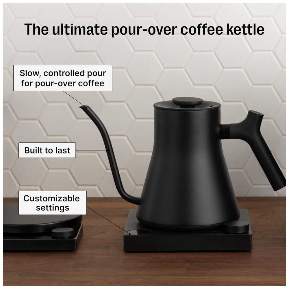 Com 1200 watts de potência, a chaleira aquece rapidamente a água, suportando até 0,9 litro. O corpo em aço inoxidável oferece durabilidade e resistência à corrosão, com componentes externos de silicone alimentício que não entram em contato com a água. A alça ergonômica em plástico e o puxador da tampa fornecem conforto no manuseio. O produto permite atualização do firmware via conexão WiFi pelo aplicativo Fellow, garantindo acesso a melhorias contínuas.