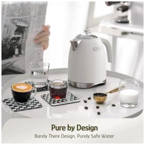 O acionamento é realizado por botão único com iluminação em LED, que indica visualmente o funcionamento durante o aquecimento. O sistema de segurança integra desligamento automático ao atingir a fervura e proteção contra funcionamento a seco, interrompendo o aquecimento caso não haja água suficiente no interior. O design sem fio em uso (corpo removível da base) facilita o serviço à mesa e o armazenamento, enquanto a base compacta auxilia na organização do cabo de alimentação na bancada. As recomendações de cuidado incluem descalcificação periódica com solução ácida leve, como vinagre branco ou suco de limão, seguida de enxágue completo.