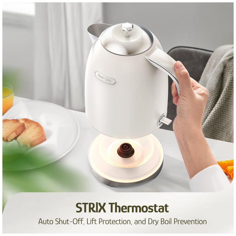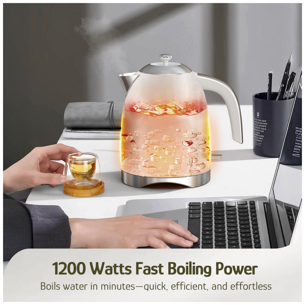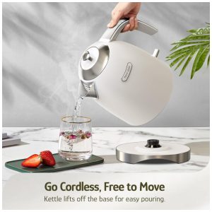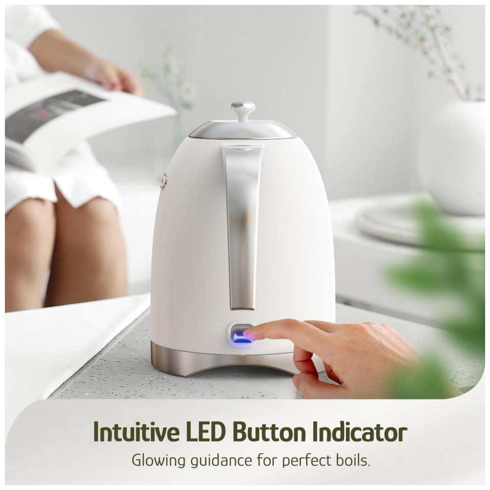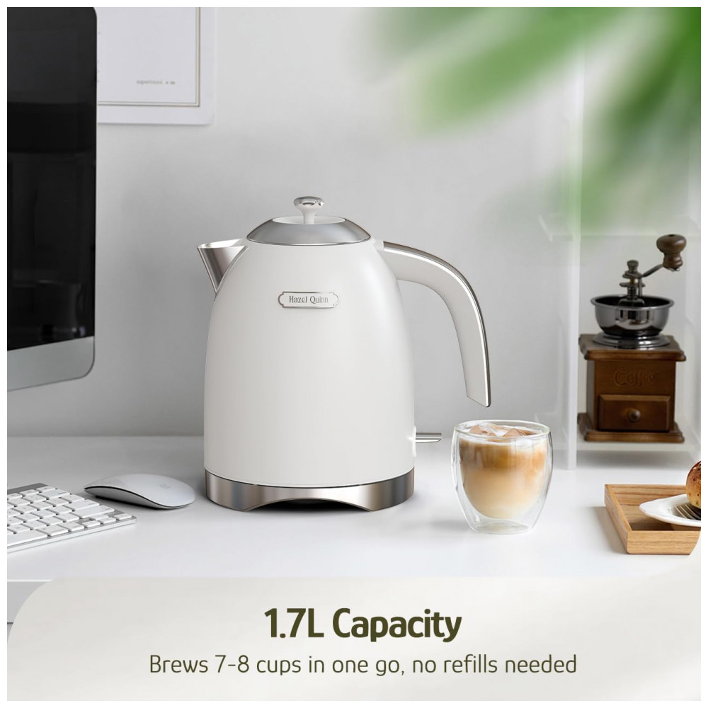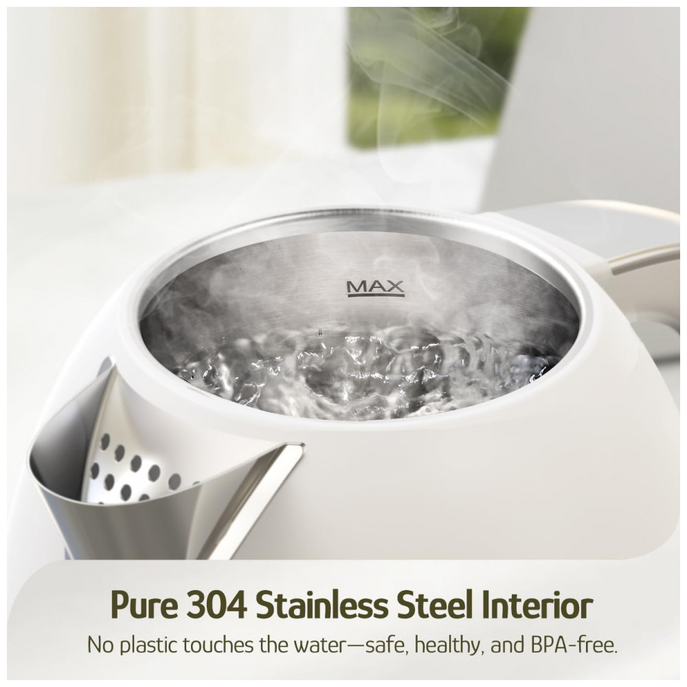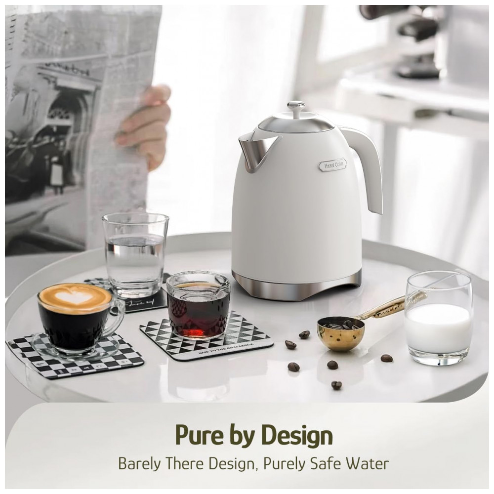 A chaleira elétrica Hazel Quinn UXSH008 foi projetada para aquecimento de água em uso doméstico, com capacidade de 1,7 litros e corpo em acabamento branco pérola sobre estrutura em aço inoxidável 304. O interior, incluindo tampa e filtro, é totalmente em aço inoxidável em contato com a água, sem componentes plásticos internos, adequado para preparo de bebidas como chá, café e outras infusões. A potência de 1200W permite ferver desde pequenas quantidades até o volume máximo em poucos minutos, com base giratória de 360° que facilita o posicionamento da jarra sobre a base.