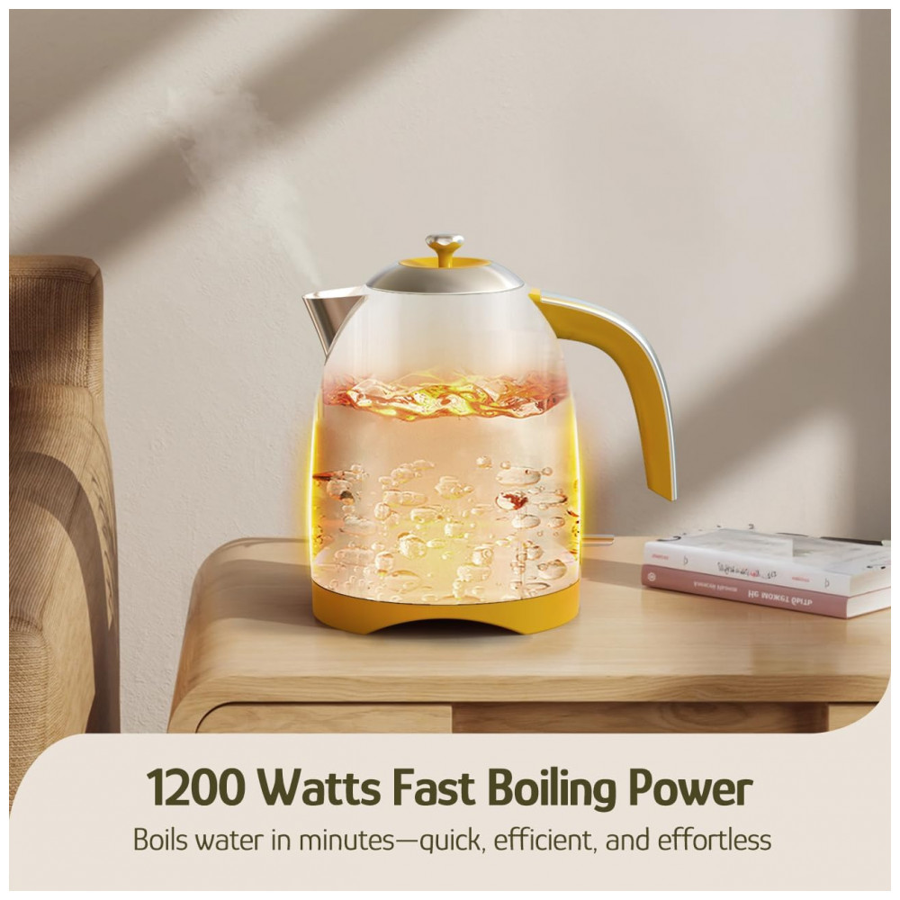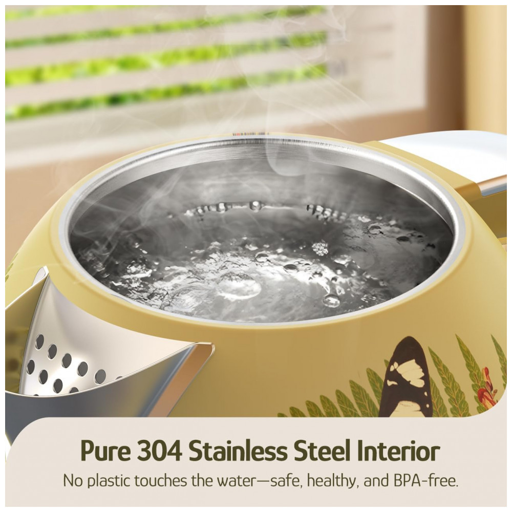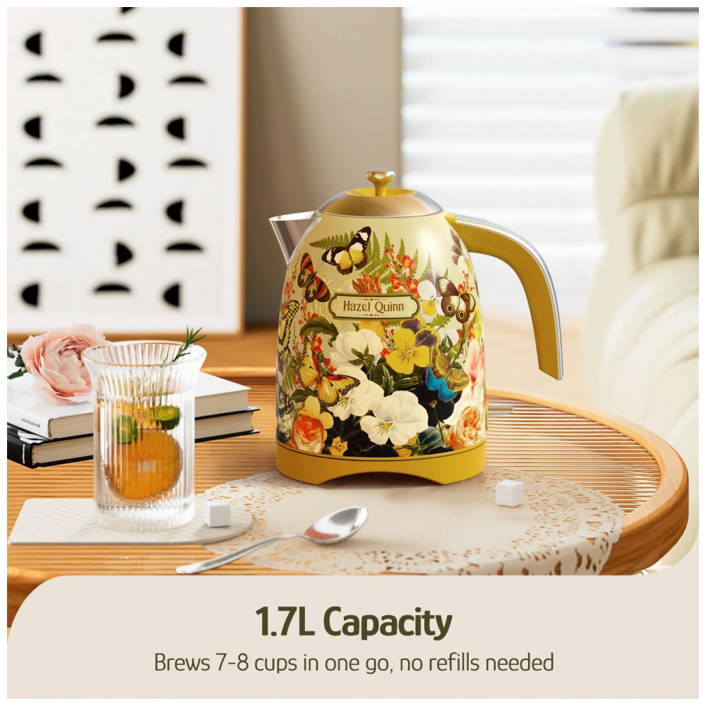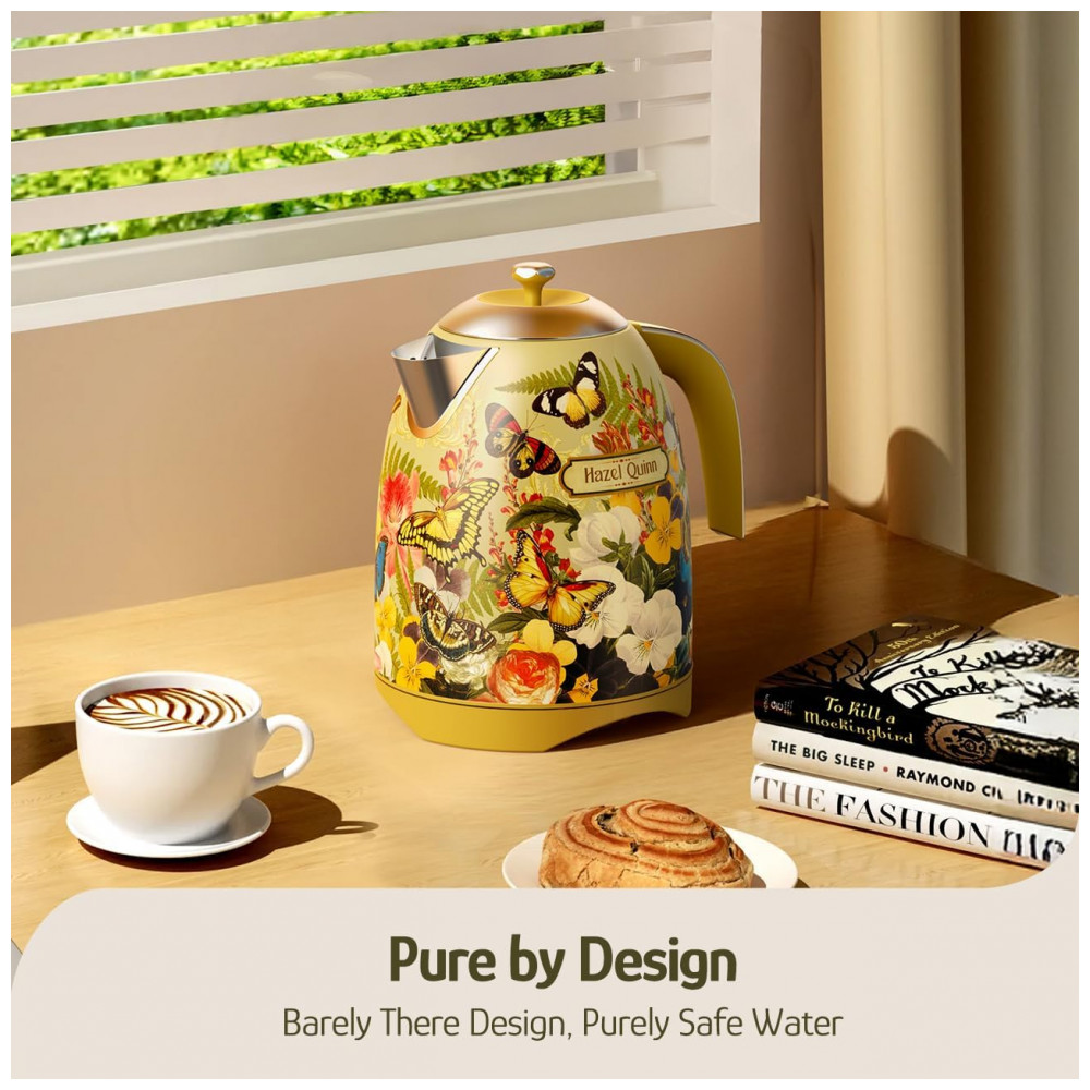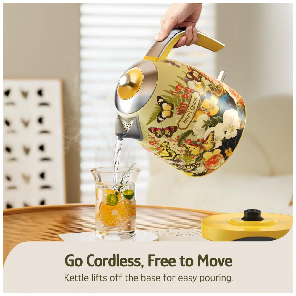 A chaleira elétrica Hazel Quinn UXSH008 edição floral desenvolvida em colaboração com Eduardo Recife foi projetada para aquecimento de água em uso doméstico, com capacidade de 1,7 litros e corpo metálico pintado com estampa floral. O interior, incluindo tampa e filtro, é totalmente em aço inoxidável 304 em contato com a água, sem peças plásticas internas, adequado para preparo de chá, café e outras bebidas quentes. A potência de 1200W permite aquecer pequenas quantidades ou o volume máximo em poucos minutos, utilizando base giratória de 360° que facilita o encaixe da jarra sobre a base.