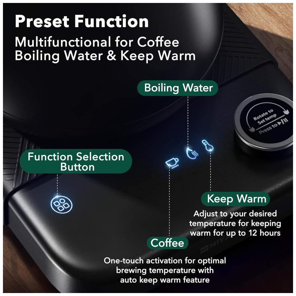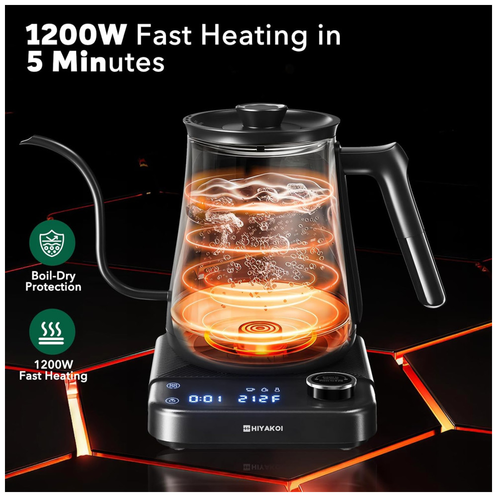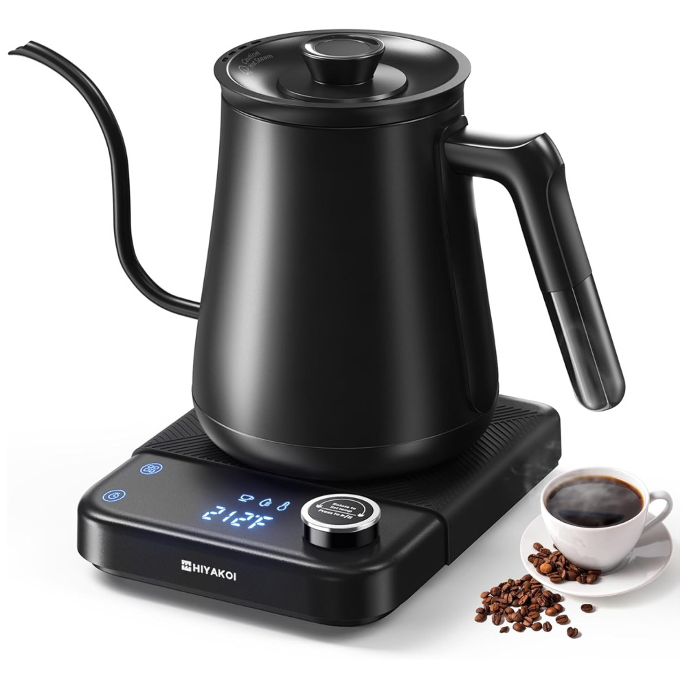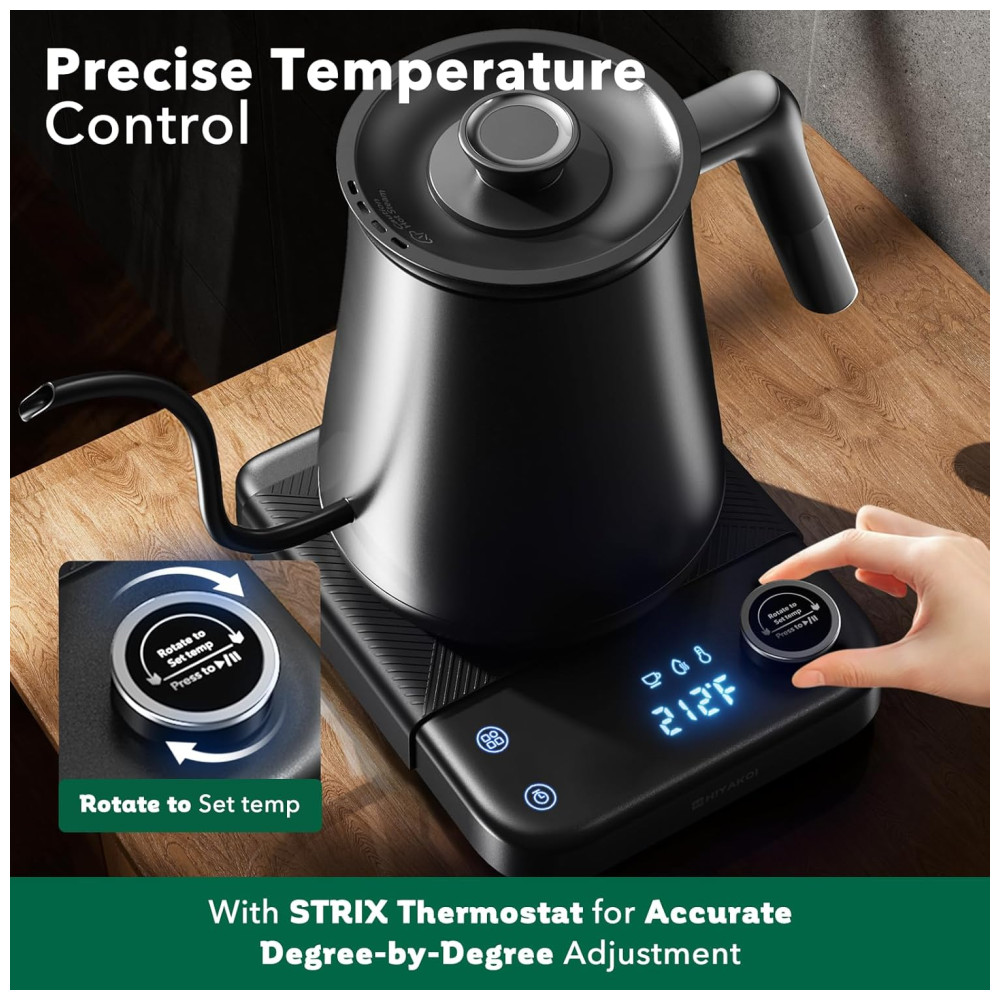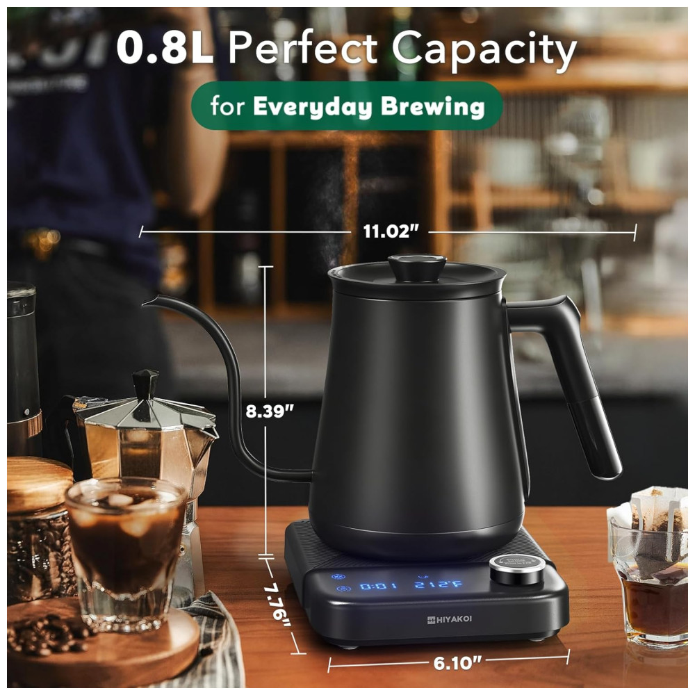 Chaleira Elétrica HIYAKOI Gooseneck com Controle de Temperatura Ideal para Café e Chá Aquecimento Rápido de 1200W em Aço Inoxidável 08L