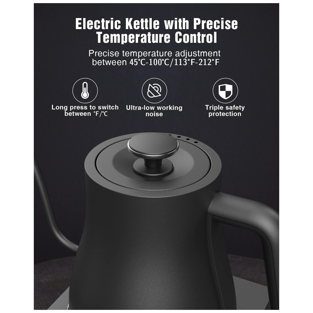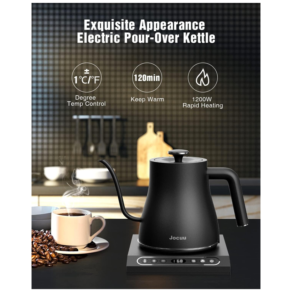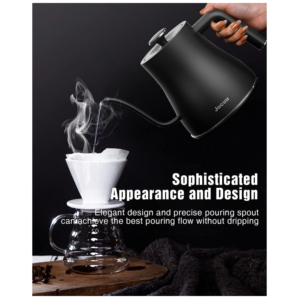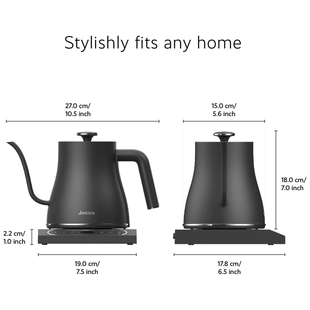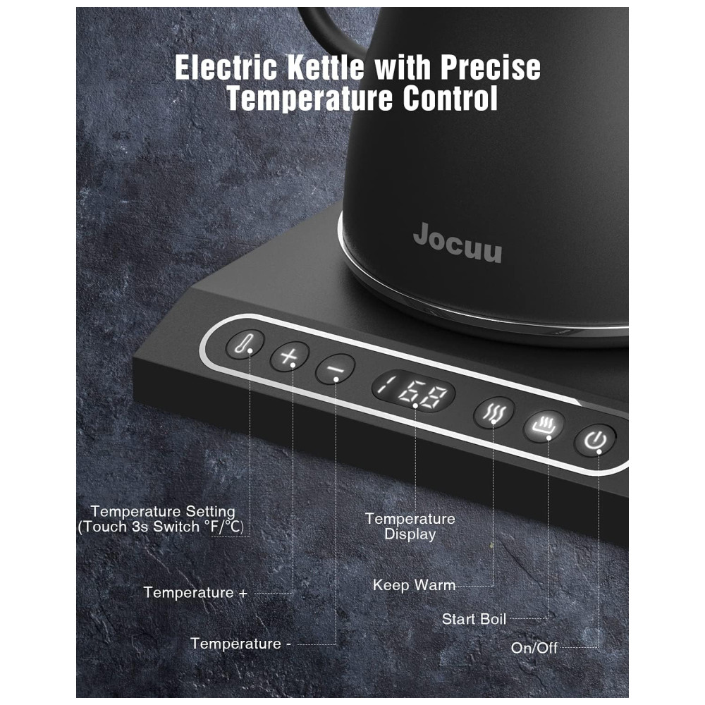 Chaleira Elétrica com Controle de Temperatura Ajustável Prepare sua bebida na temperatura perfeita com a chaleira elétrica pescoço de ganso Jocuu. Seu controle de temperatura varia de 45C a 100C ou 113F a 212F e é ajustável em um grau para preparar seu café ou chá com precisão.