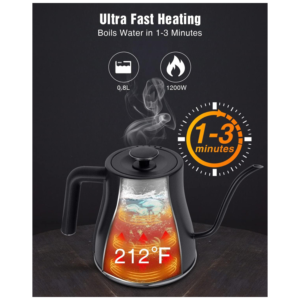 Aquecimento rápido e proteção de segurança de 4 dobras a chaleira elétrica opera a 1200 W, ferve a água em 1 3 minutos e desliga automaticamente quando a água atinge a temperatura definida. Seu design à prova de vazamentos e recursos adicionais de segurança, como o sensor de temperatura NTC e a função de fervura, permitem que a chaleira desligue quando a água secar completamente.