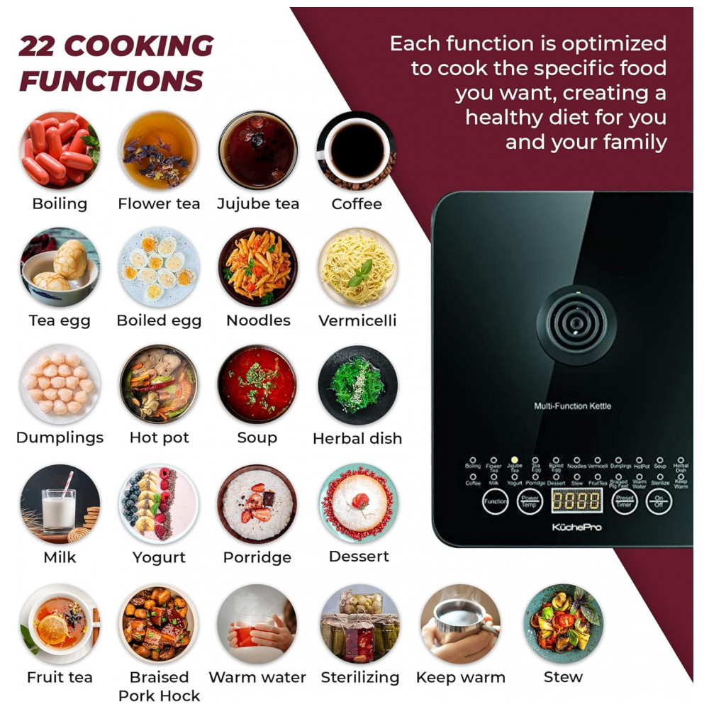 Múltiplo uso 22 em 1 A chaleira multifuncional possui 22 programas integrados inteligentes, perfeitos para fazer chá de flores, chá de frutas, panela quente, bolinhos, sobremesa, sopa, sobremesa, iogurte, ensopado, café, ensopado de ninho de pássaro , mingau, etc. Também pode ser como aquecedor de leite e para cozinhar comida de bebê.
