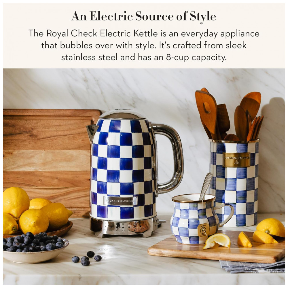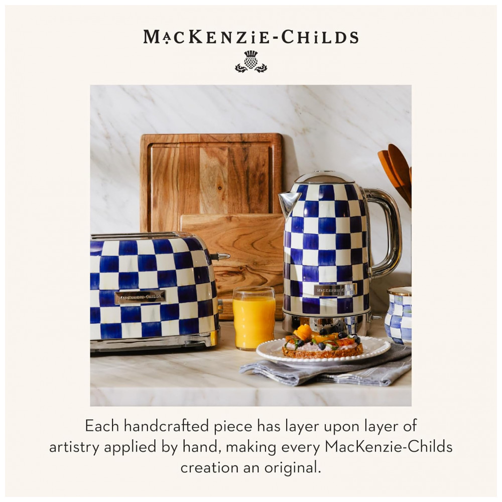Conteúdo da embalagem: 1 chaleira elétrica MacKenzie-Childs Sterling Check, 1 base elétrica, documentação do fabricante
